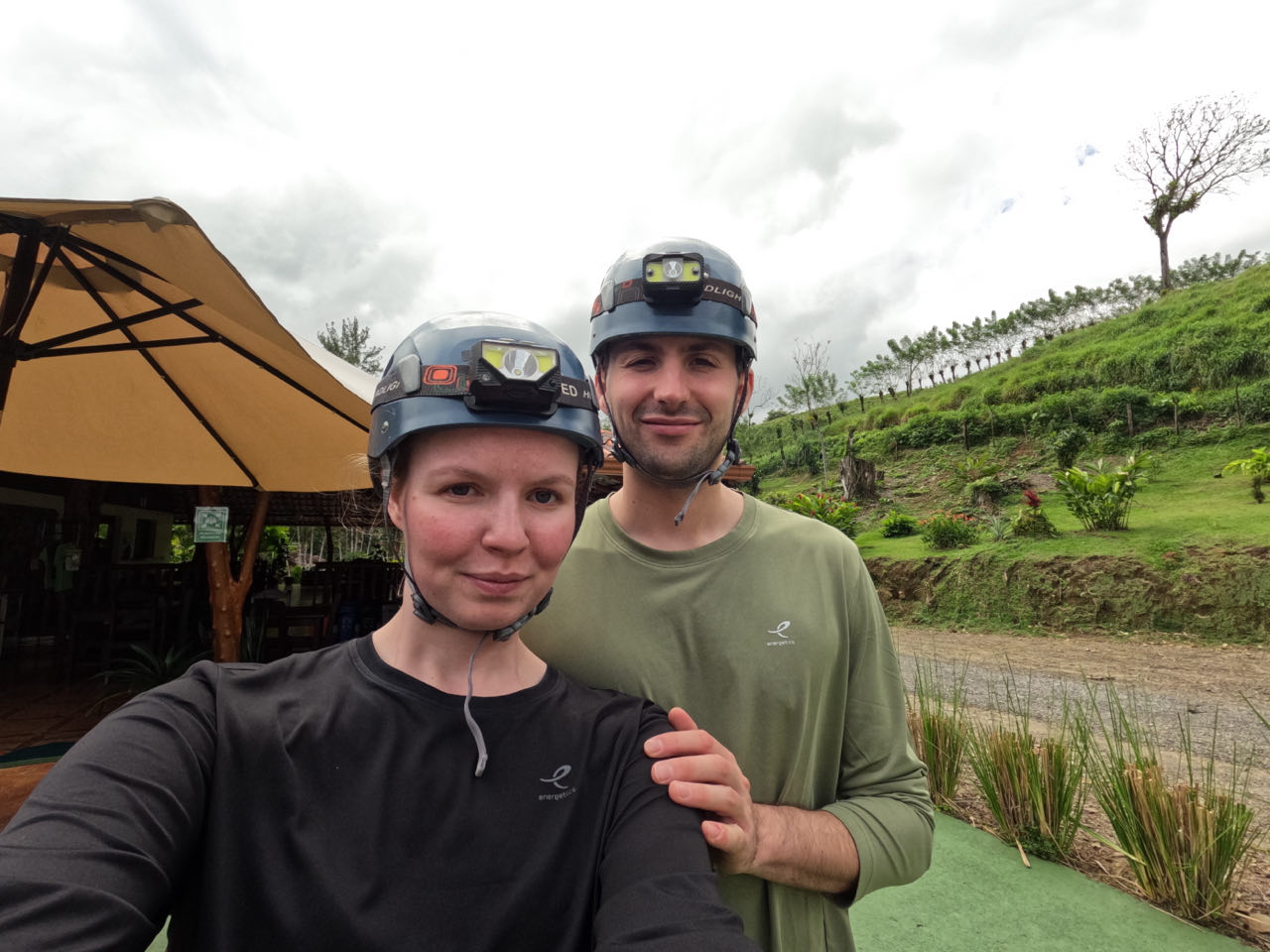 Ce matin, nous partons pour les Cavernes de Venado, j’ai choisi une activité qui sort un peu de l’ordinaire. Nous sommes équipés de casques, lampes frontales, chaussures d’eau et de masques (pour ne pas respirer les crottes de chauve souris…).