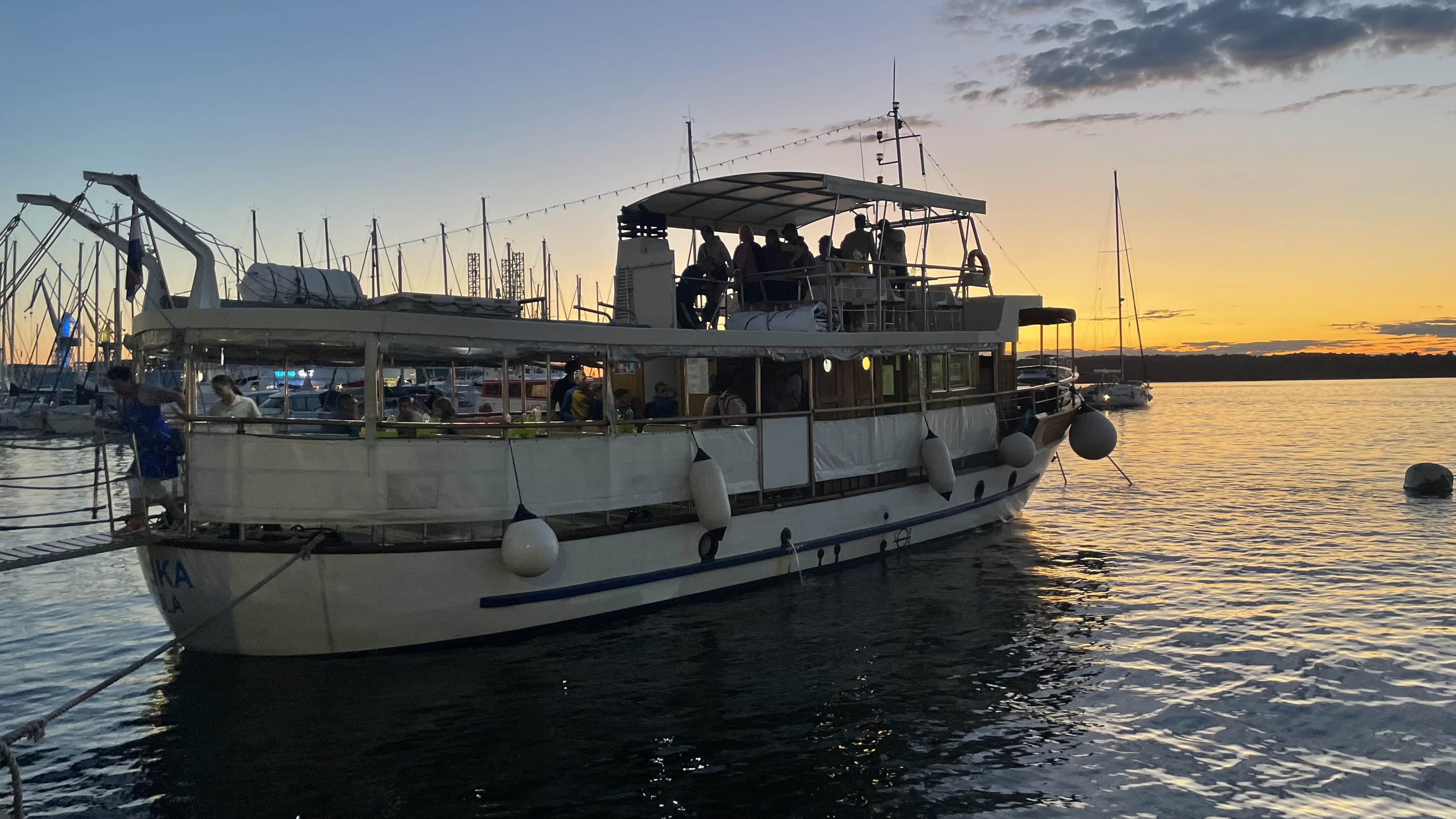 Nous rentrons déjeuner à l’appartement et après une petite sieste, nous partons pour Pula. Nous espérons trouver une excursion pour voir des dauphins avec coucher de soleil, mais sur internet tout affiche complet ... on tente notre chance sur place. Effectivement, même sur place les excursions sont bookées jusqu’à ce weekend, mais par "miracle" on trouve finalement un bateau qui a de la place pour nous 5, départ immédiat !