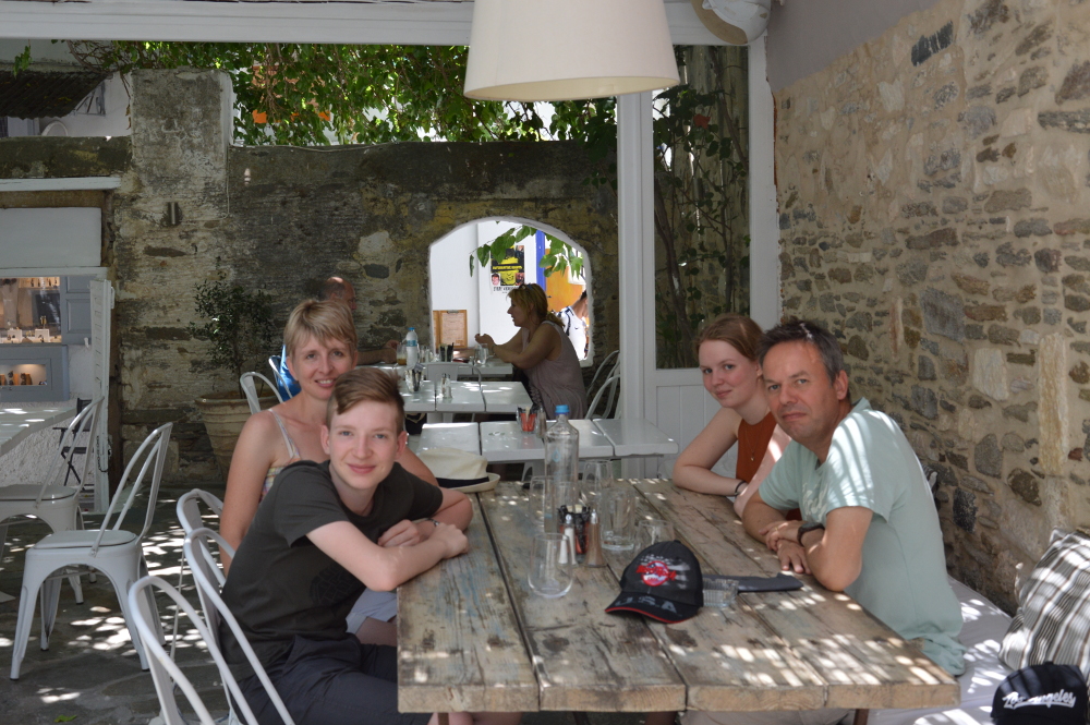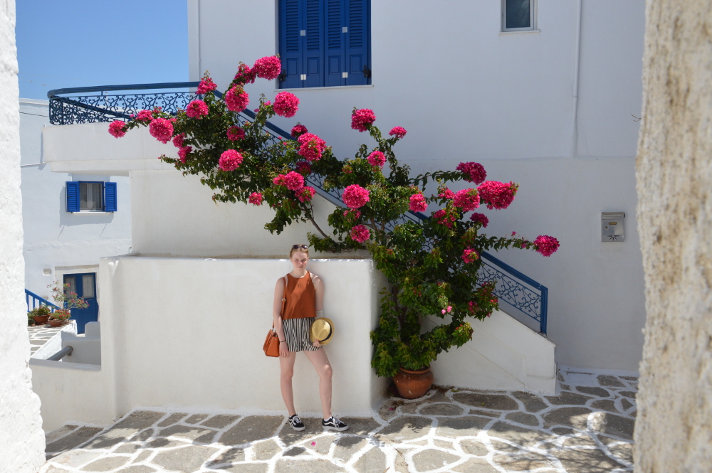 Pourtant, en la visitant aujourd’hui, je l’ai trouvée très charmante ! Les petites rues étroites blanches et bleues étaient magnifiques ! Plus grande que Naoussa, Parikia est gorgée d’endroits charmants. Ses rues, ses moulins, ses boutiques, ses restaurants, son port, tout est joli ! On ne pouvait résister à l’envie de déjeuner dans un restaurant très bien placé à l’ombre d’une pergola décorée de vignes. En plus la cuisine méditerranéenne qu’on nous a servie, était délicieuse ! J’ai adoré ma moussaka !