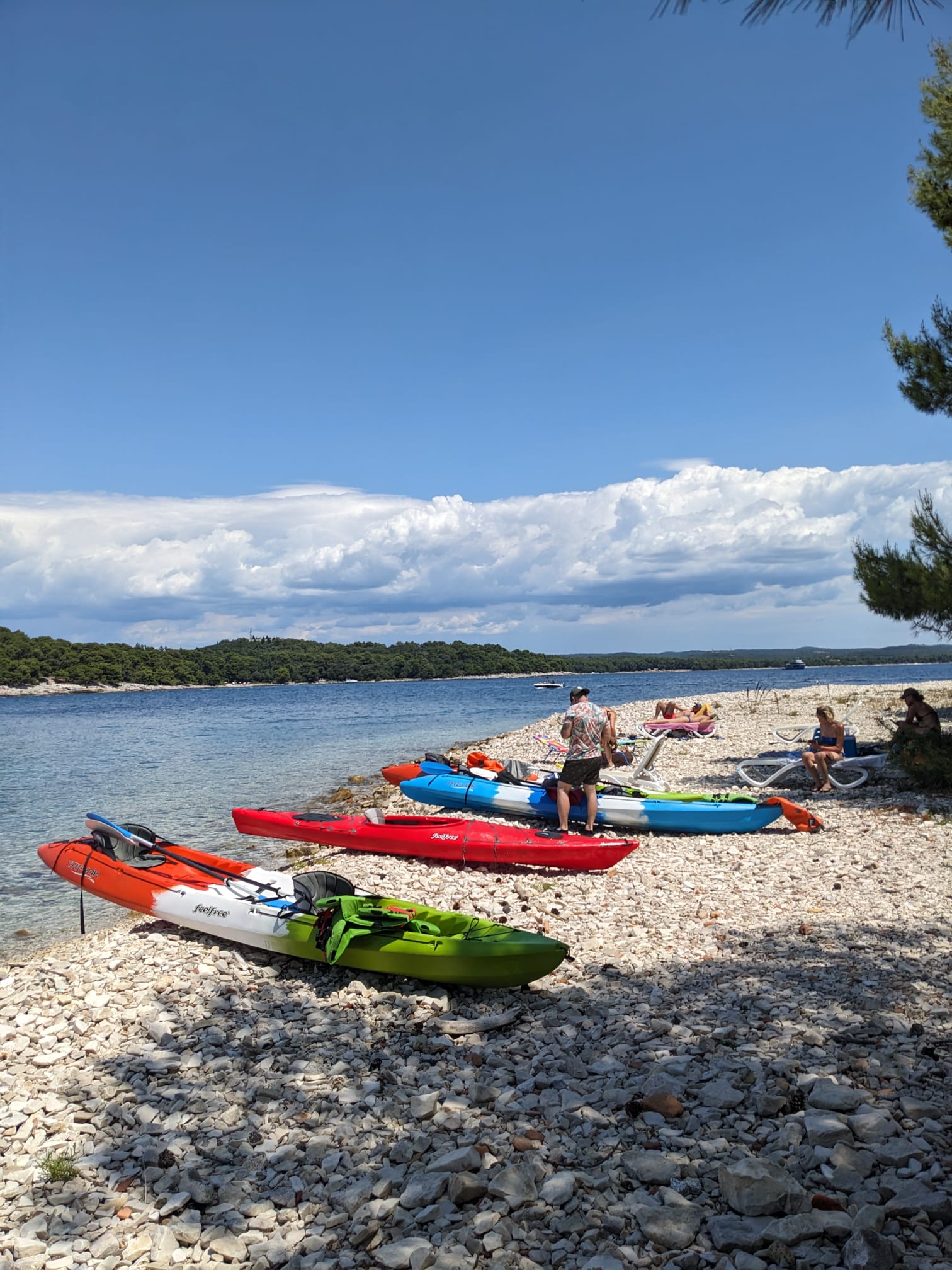 On commence par 40min de kayak pour rejoindre une île. Thomas, Nathan et moi prenons le kayak 3 places. La mer est calme, très peu de vagues, on avance vite ! Arrivés sur l’île, le guide nous donne quelques informations historiques en anglais. L’île appartenait autrefois à une seule famille avant d’être rachetée pour de l’hôtellerie et propose donc aujourd’hui plusieurs activités à touristes. L’île a également été reliée à son île voisine par une petite digue. Cette seconde île est en revanche restée très sauvage. Nous avons 1h30 de temps libre avant d’effectuer le retour en kayak. On choisit de rester sur l’île plus sauvage. On trouve des transats dispersés en front de mer, on en profite. On se baigne dans une eau bien transparente. On y voit même des sortes de méduses translucides. Il y a en a beaucoup, mais elles ont l’air inoffensives. Seule maman n’a pas osé se baigner avec les petites méduses. Pour le retour, on échange les groupes : Thomas prend le kayak 3 places avec papa et maman, mais ça ne se passe pas comme à l’aller ! Au moment d’embarquer sur la plage, le kayak se retourne. Le retour commence avec un apriori, maman a peur et ne veut plus pagayer. Il y a plus de vagues que ce matin, leur kayak semble moins stable. Au final, ils n’ont pas du tout aimé le retour à 3 !