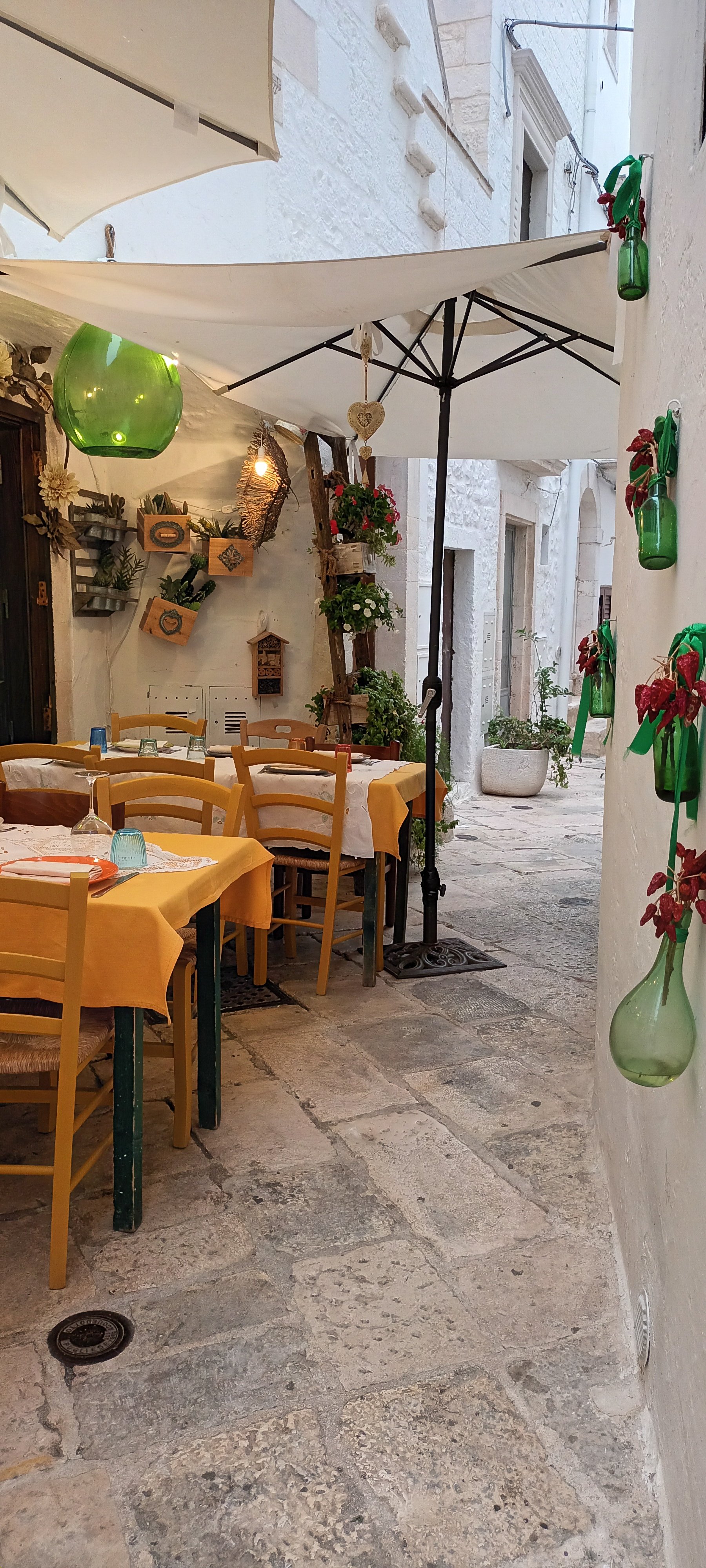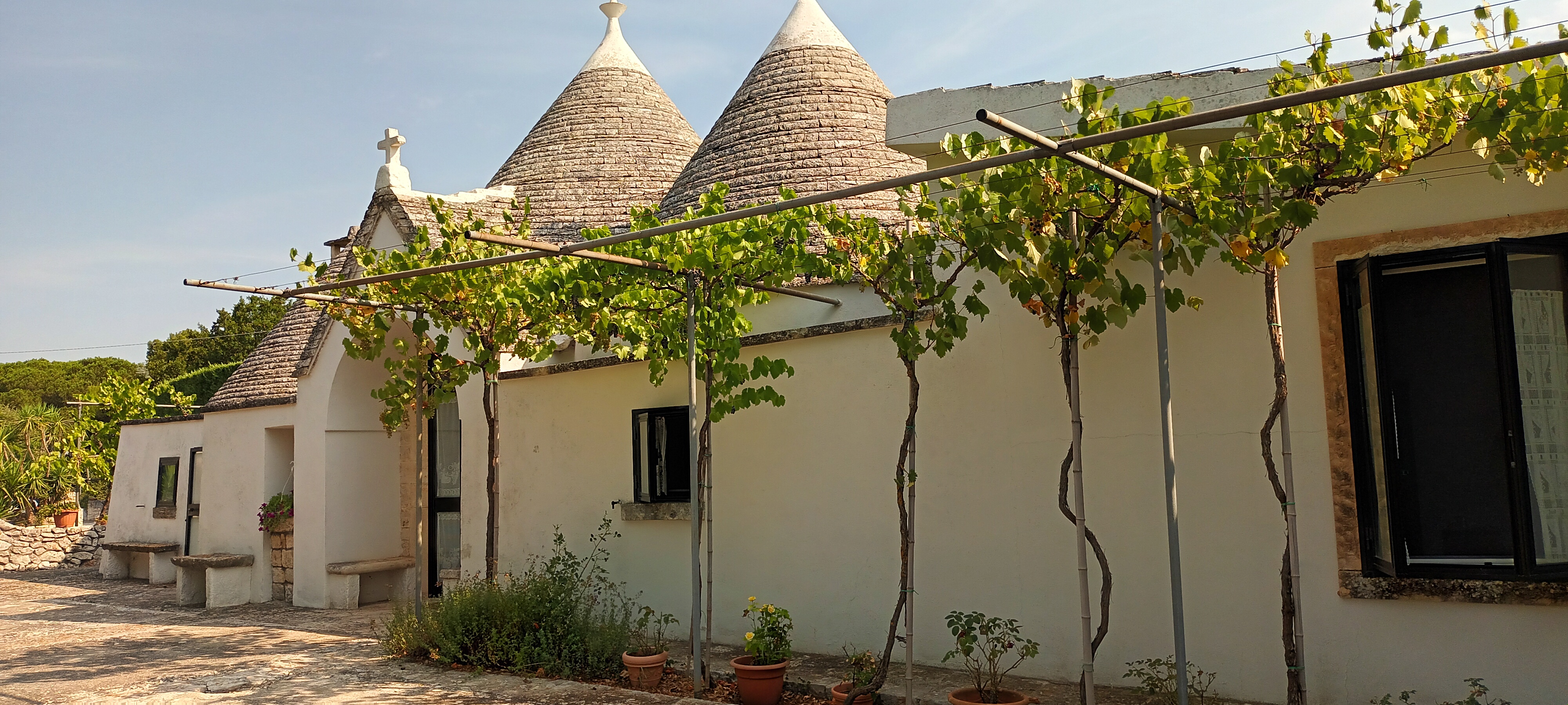 Jeudi matin, nous partons faire quelques courses au supermarceto et nous mangeons sur la terrasse de notre trullo. Bien agréable cette terrasse, on est toujours à l’ombre grâce aux arbres !