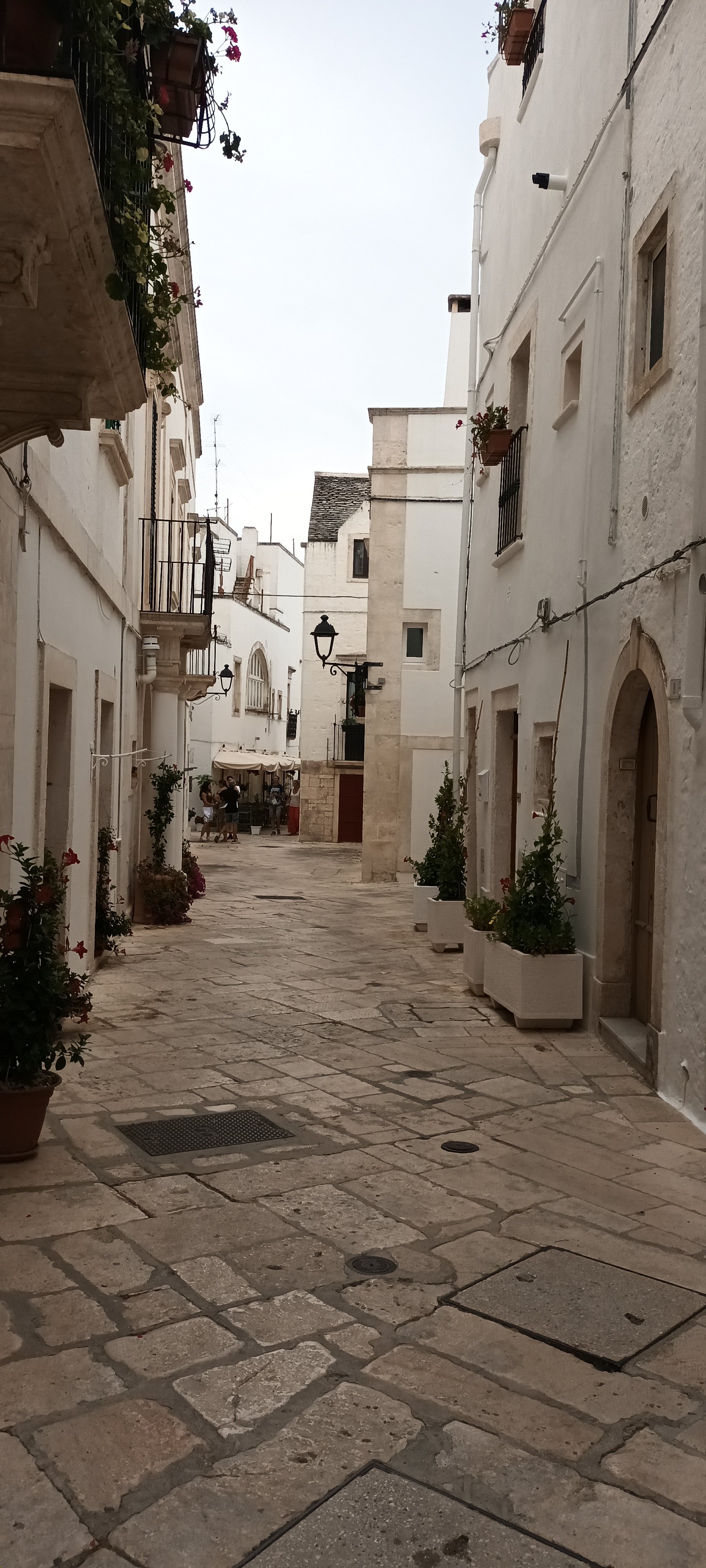 En début d’après-midi, nous allons nous rafraîchir à la piscine. Le temps devient orageux. Nous partons vers Locorotondo où nous avons prévu de faire une balade en vélo. Nous louons les vélos au centre ville et nous commençons notre tour au milieu de la circulation....Pas sympa de rouler au milieu des voitures. Heureusement, nous rejoignons bientôt un chemin bucolique au milieu des vignes, des oliviers et des trulli. Il manque juste le soleil ! Mais vu les pentes que nous devons emprunter, c’est pas plus mal qu’il fasse moins chaud ! Sur le chemin du retour, nous évitons la circulation en passant par la vieille ville de Locorotondo. Le centre historique paraît très joli. Cela nous donne envie d’y passer la soirée. Nous arpentons les rues de cette charmante ville aux façades blanches. J’adore admirer ces rues joliment décorées.