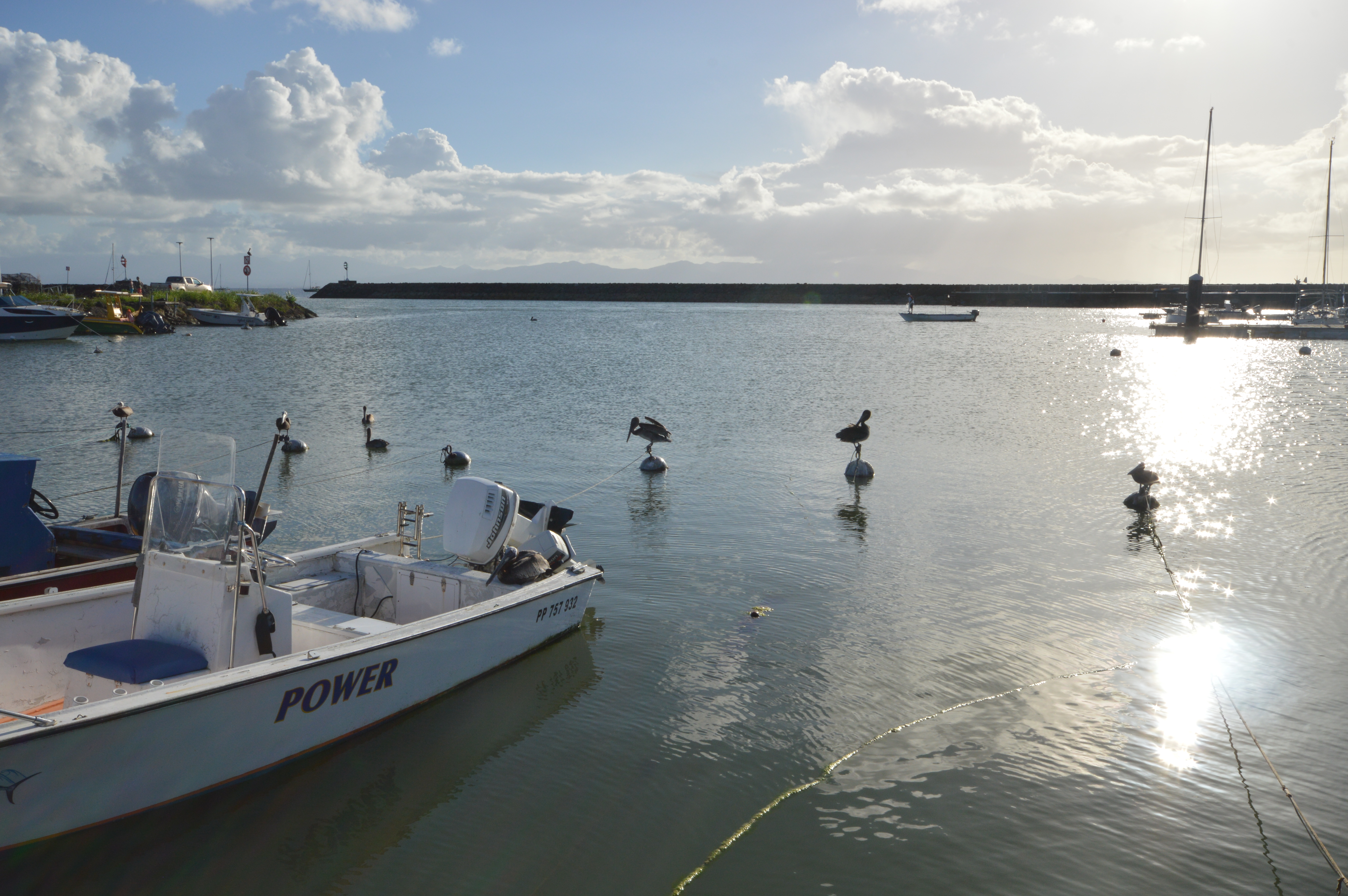 A la marina nous prenons en photo des pélicans qui attendent immobile le poisson.