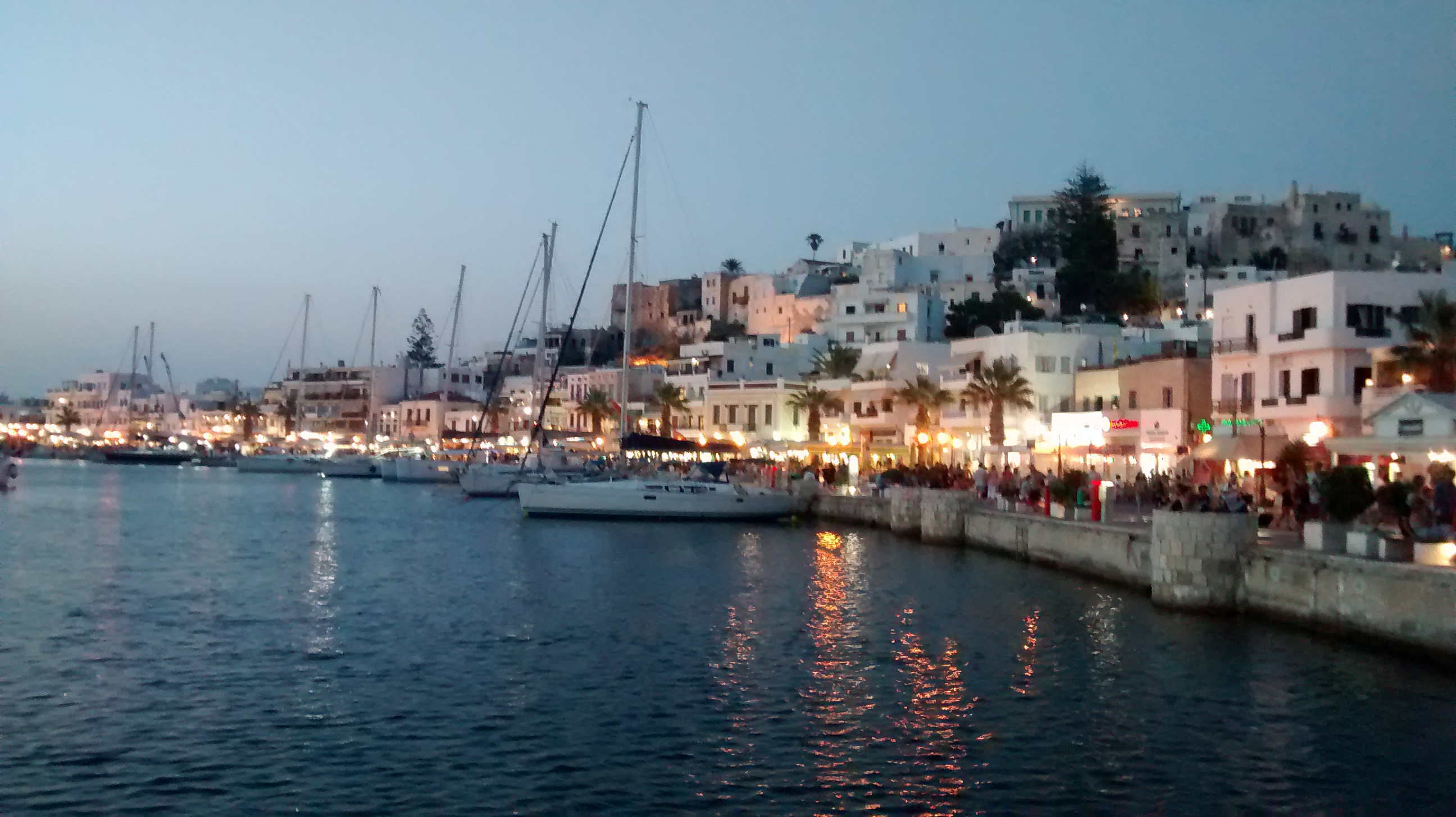 Notre dernière île.Le ciel et la mer sont toujours aussi bleus. Il fait chaud , le vent est tombé ! Heureusement nous profitons de la plage et de la piscine depuis 2 jours. A Naxos on retrouve le style des cyclades , maisons blanches et rues étroites et surtout la cuisine grecque que nous adorons. Ce sont des odeurs de poissons grillés, de légumes méditerranéens, aubergines, poivrons, tomates, farcies , gratinés au fromage local et à l’huile d’olive. Servis avec un rosé local pour un prix très abordable. Ce soir nous avons mangé sur le port (un air de Cap d’Agde) pour 40 euros. Naxos est la plus grande des iles des cyclades que nous avons prévu de visiter ces 3 jours en voiture.