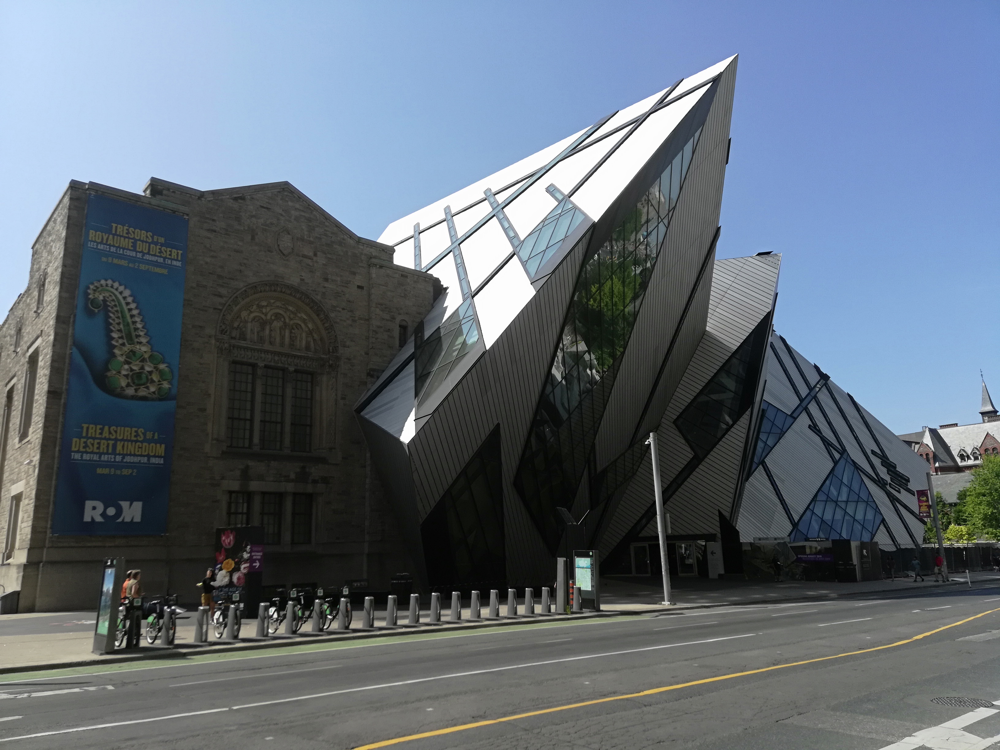 Lundi 5 août, dernier jour, nous décidons d’aller visiter le musée ROM qui est très particulier de l’extérieur car il allie l’ancien et le très moderne. C’est l’architecte Daniel Libeskind qui a conçu la partie très moderne et nous étions allés à une de ses conférences. Trop hâte de voir son œuvre ! C’est spécial mais on aime beaucoup.