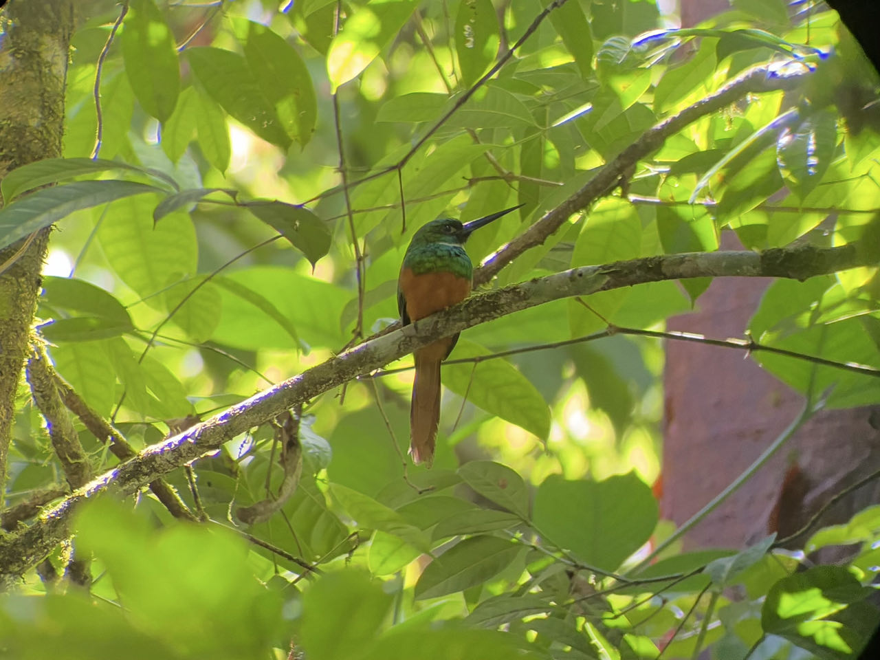 Nous voyons dès le début de la visite un singe écureuil, il est tout petit et saute d’arbre en arbre. Pendant la balade on voit également une « gold spider », des singes araignées et même un fourmilier dans les arbres ! De l’autre côté de la berge on voit un crocodile. Nous prenons le déjeuner dans le réfectoire des rangers puis nous repartons en excursion. On voit deux petits caïmans, encore des singes araignées et quelques beaux oiseaux. Notre guide est équipée d’une lunette super zoom qui nous permet de voir très nettement les animaux. Les photos ont été prises dans la lunette. On prend le bateau retour vers 13h.