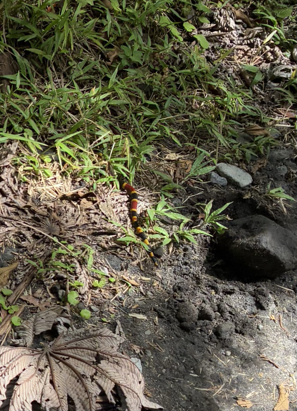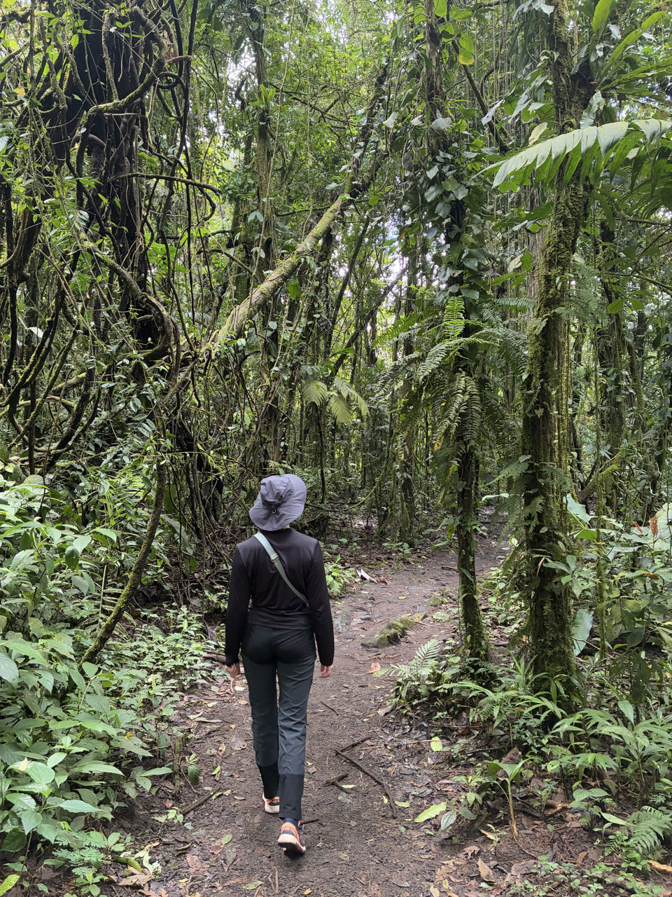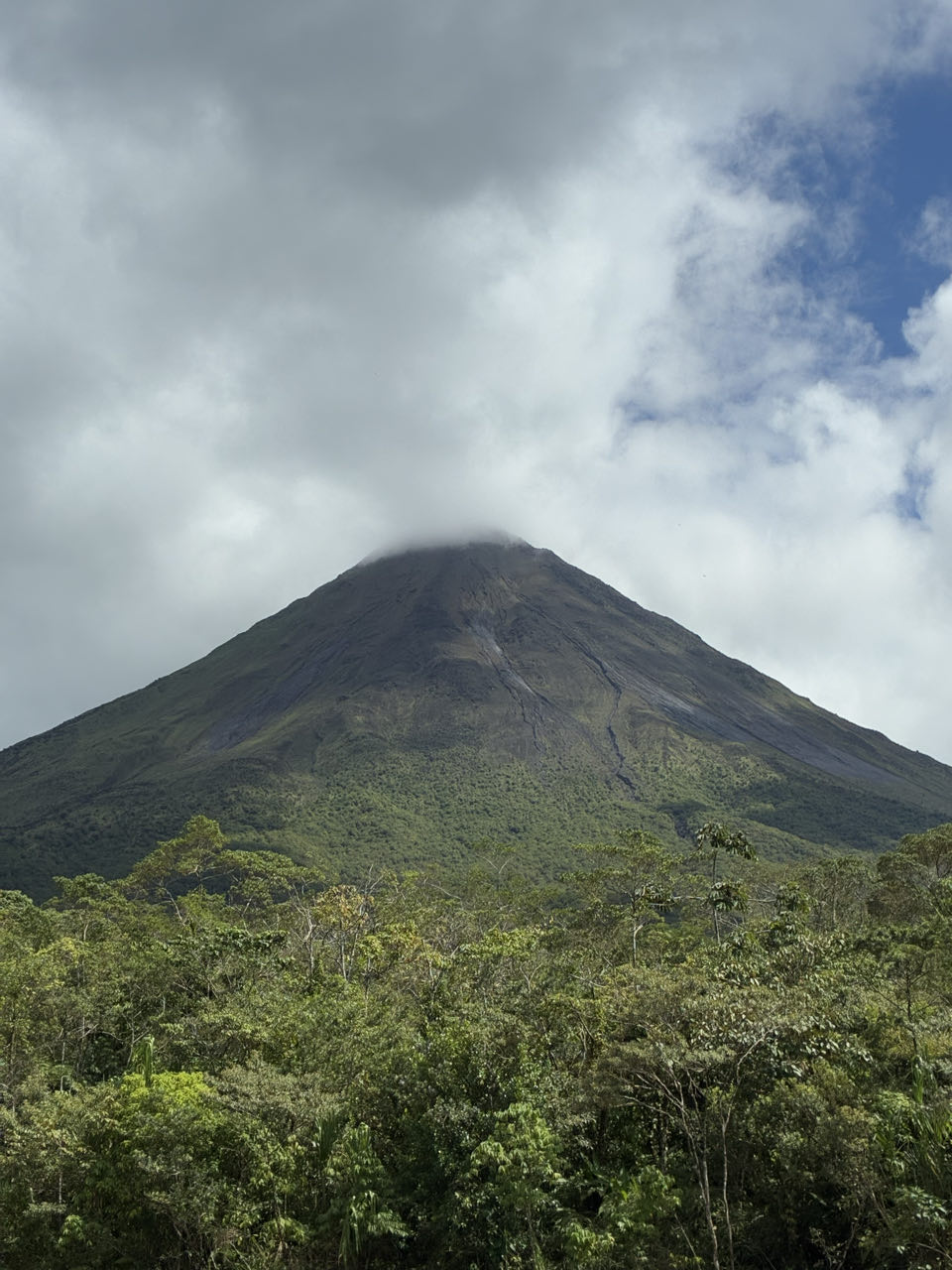 Au milieu de la rando, il y a un mirador sur le volcan Arenal. C’est la seule partie du sentier qui n’est pas ombragée : le mirador se situe sur les coulées de lave de 1992. La nature commence à se régénérer, mais ne laisse pas encore place aux grands arbres. Ce sont d’abord de plus petites plantes qui poussent rapidement, qui apportent de la fraîcheur au sol pour laisser de plus grandes plantes pousser, plus lentement, et ainsi de suite, pour recréer une forêt tropicale humide