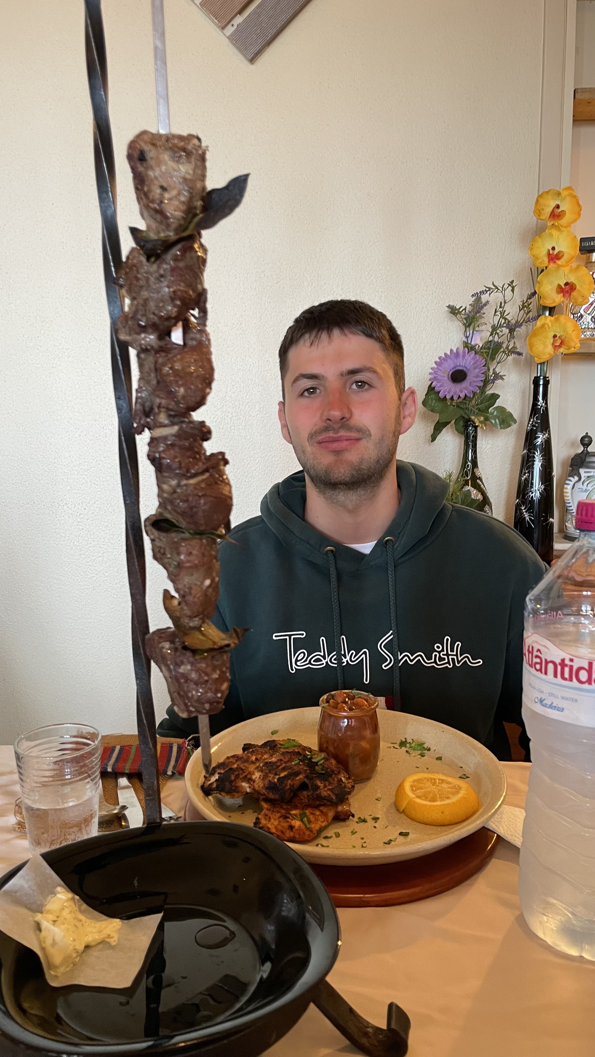Il est presque midi, on voulait s’arrêter manger à Paul do Mar, mais on ne trouve pas de charme à ce village, on passe notre chemin. On repère un restaurant implanté sur le mirador de Faja da Ovelha, magnifique point de vue, mais les avis sur la cuisine sont mitigés. On décide finalement de rejoindre le dernier village, Ponta do Pargo. Nous nous régalons dans un restaurant de barbecue ! Poulet Cajun pour Nathan et grande brochette de bœuf pour moi. Marinée avec des feuilles de laurier, ce sont les meilleures que j’ai goûtées. On craque pour les crumbles en dessert qui sont aussi bons