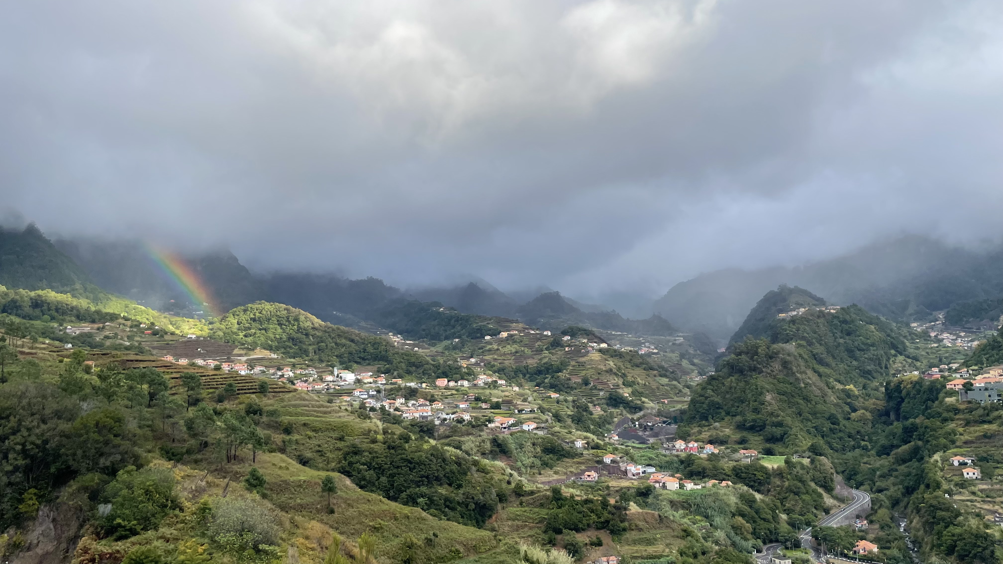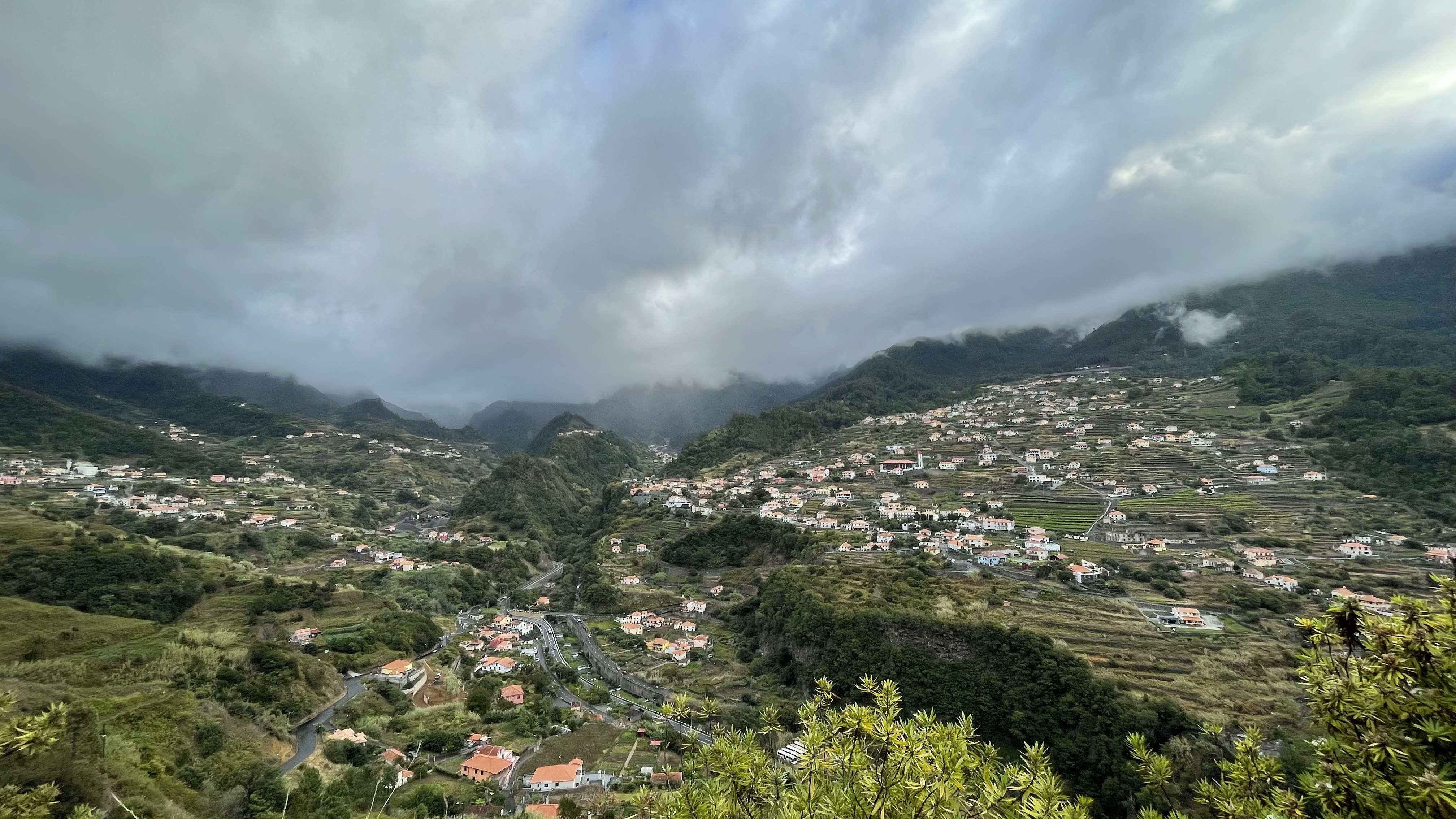 Nous poursuivons notre voyage dans la brume. Le décor et la végétation sont totalement différents de ce qu’on a vu au sud. Fini les bananiers, on y voit beaucoup plus de fougères. Nous devions nous arrêter à plusieurs points de vue sur la côte Ouest, mais on y voit rien avec la brume. On passe devant les piscines naturelles de Porto Moniz, on espère qu’il fera plus beau demain pour nous y baigner.
