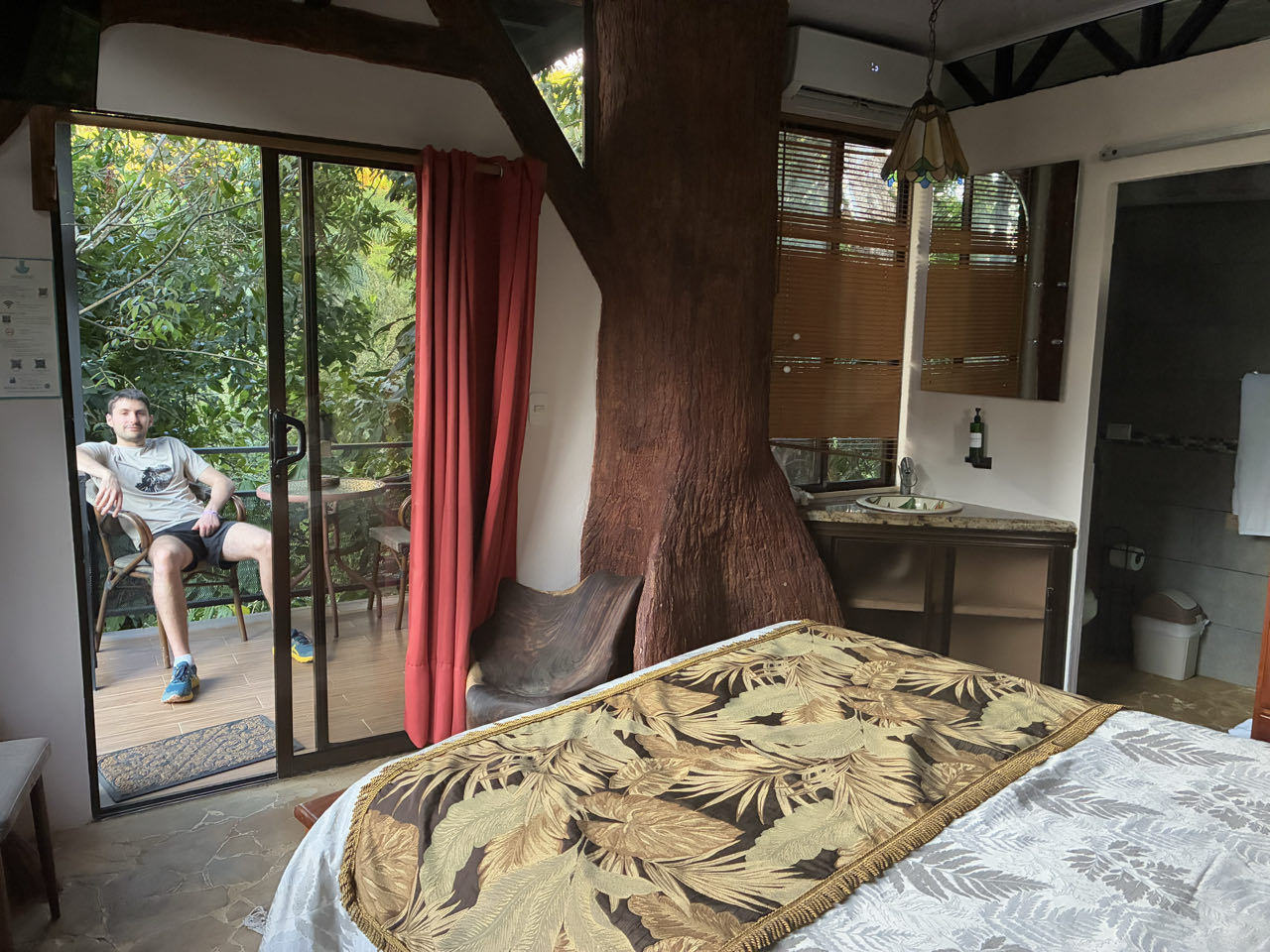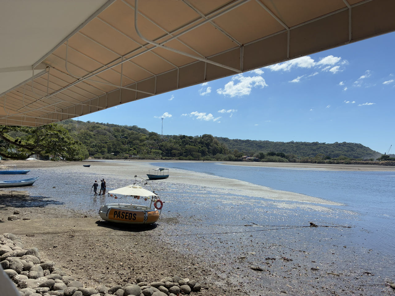 On poursuit notre chemin jusqu’au pont de Tarcoles. Il est connu parce qu’à coup sûr on peut apercevoir des crocodiles géants en contre bas. Nathan avait peur, pas envie de basculer par dessus la barrière ! Il y avait même des travaux de génie civil sous le pont, pas très loin des crocodiles (je me demande ce qu’ils ont écrit dans leur Plan de Prévention Sécurité 🤭). Il fait très chaud et lourd. On décide de prendre une glace, mais c’était une genre de chaîne pas top. Tant pis, au moins ça rafraîchit !