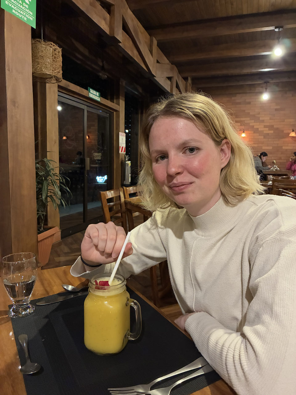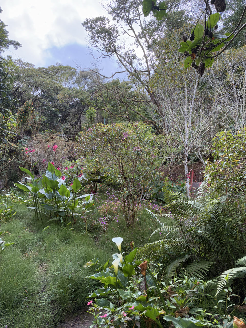 Nous arrivons dans la vallée des quetzals. Il fait tout de suite plus frais que sur la côte (10 degrés) . C’est un endroit assez reculé par rapport à la route principale qui mène à San José. Notre lodge est une petite cabane proche d’une rivière. Sur recommandation de la réceptionniste, on visite un jardin privé d’un restaurant. Il est grand et verdoyant. Ensuite on fait un sentier pour voir une cascade. Nous croisons très peu de monde pendant la balade, ce n’ est pas très touristique ici. Pour le repas du soir, Nathan mange un filet de truite de la rivière et Marine des patacones (sorte de rosti de banane plantains). Les deux plats sont très bons