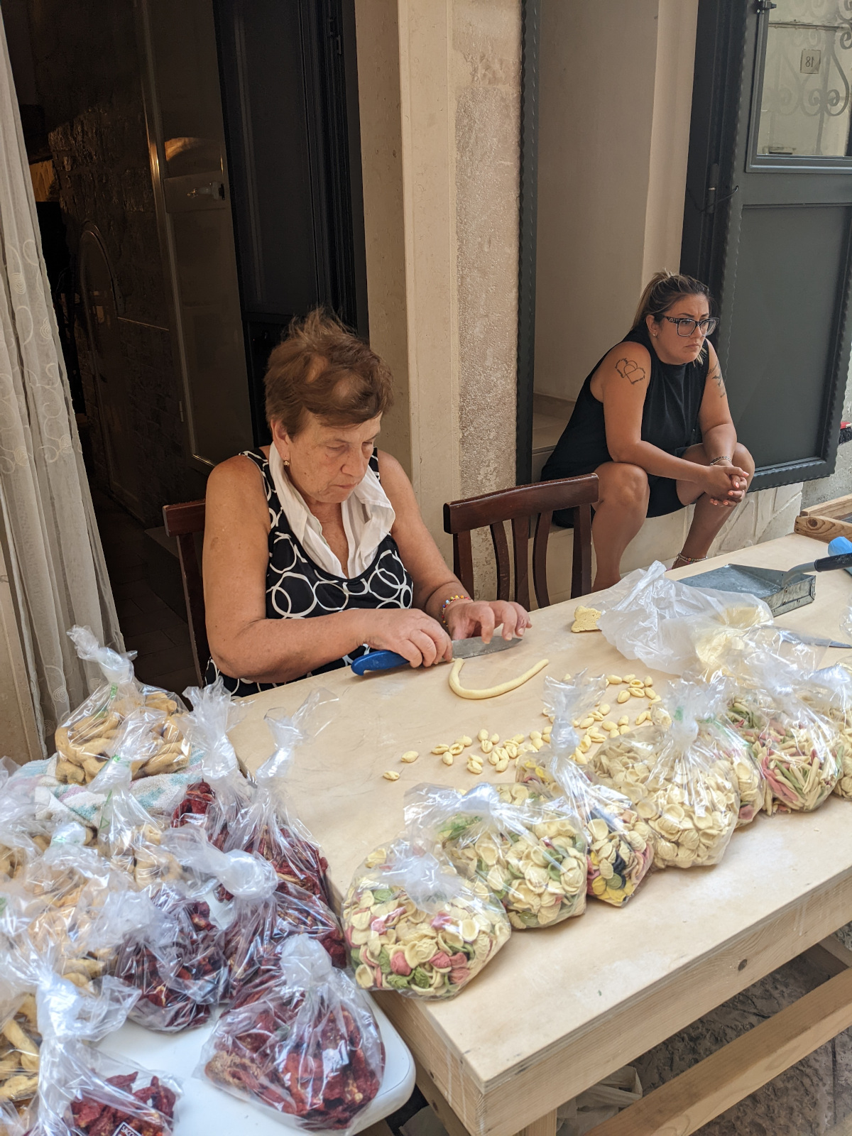 Des femmes font les Orecchietta (petites pâtes en forme d’oreilles) à la main dans la rue.