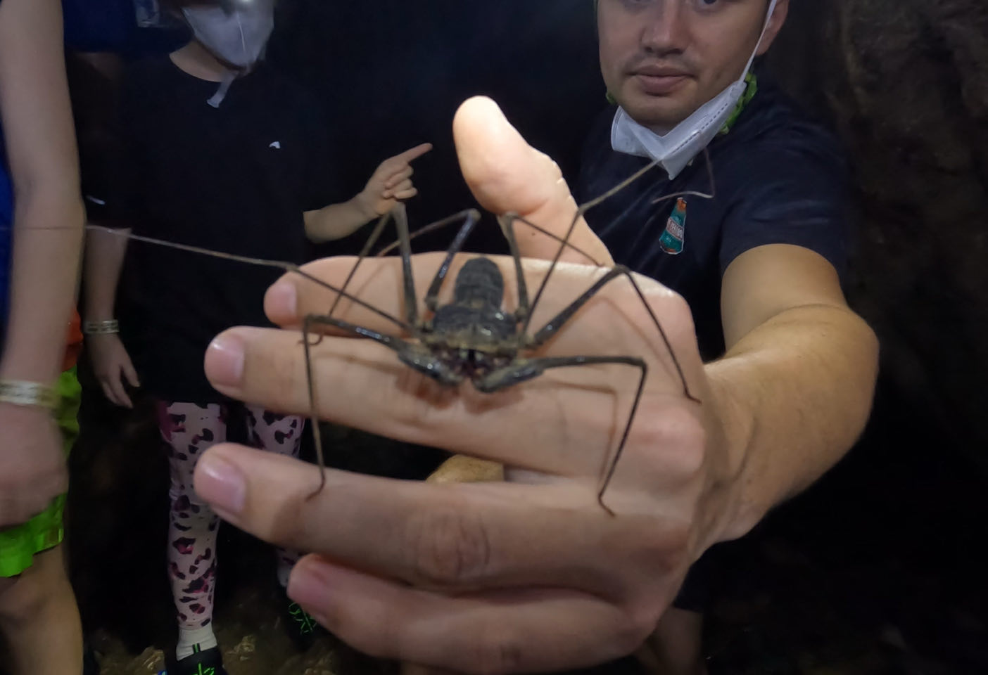 On voit aussi des espèces souterraines aveugles : chauves souris et araignées. Nous avons même vu une araignée « enceinte » avec ses œufs, et une sorte d’araignée croisée avec un scorpion.