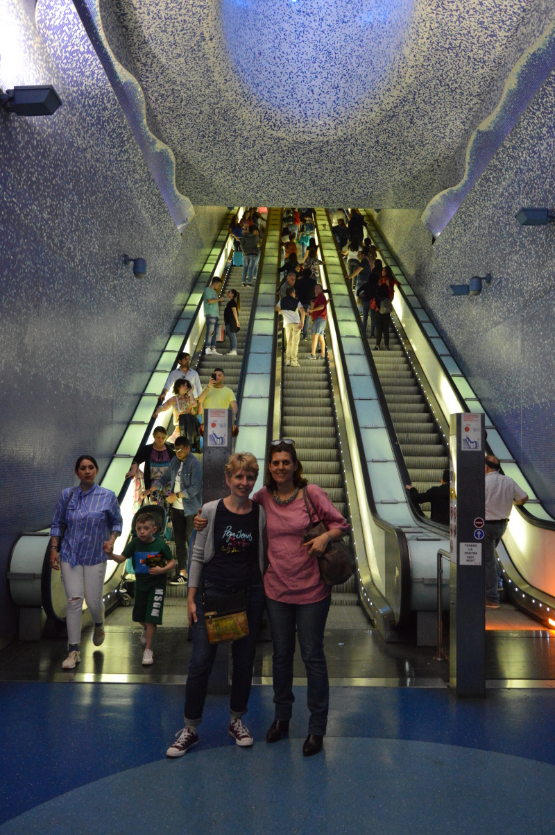 Daniella nous explique que le quartier est beaucoup plus sûr maintenant qu’il y a 10 ans mais que l’insécurité existe encore à Naples. La camora (mafia) dicte encore sa loi. Nous avons visité les monuments principaux puis nous avons pris le métro en direction du quartier espagnol pour manger et terminer la visite avec notre guide.C’était l’occasion de voir 2 belles stations de métro .
