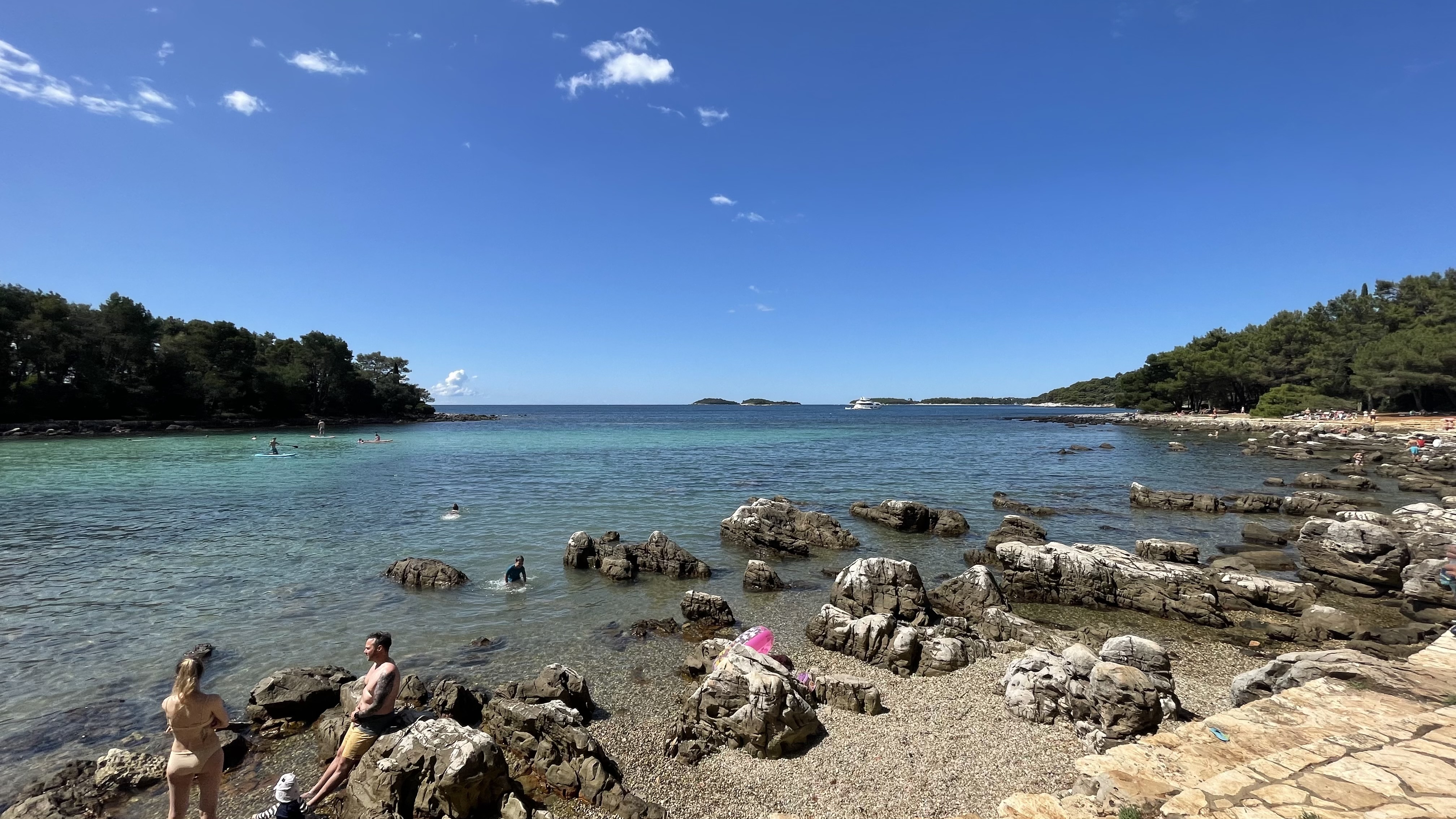 Ce matin, on teste une autre plage un peu plus éloignée de Rovinj. Encore une fois, ce n’est pas vraiment une plage mais des sortes de criques, c’est très joli ! Il ne fait pas très chaud, seuls papa et Nathan ont osé se baigner. Nous autres, nous avons préféré nous reposer à l’ombre d’une pinède.