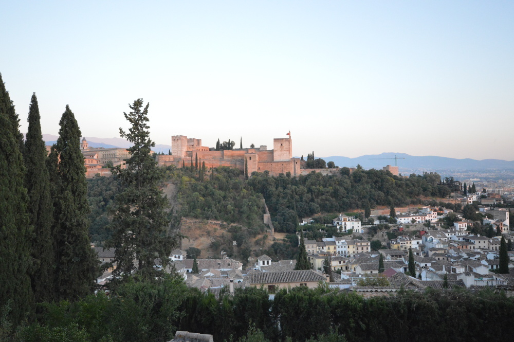 Le soir nous décidons d’aller en ville. L’hôtel nous avait conseillé de laisser la voiture à l’hôtel et de prendre le bus. On décide d’aller dans l’ancien quartier arabe de la ville. Le quartier est situé sur une colline, il faut monter à pied dans des ruelles étroites. Nous nous arrêtons dans un resto avec une vue magnifique sur l’Alhambra.