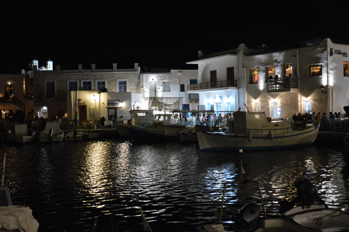 Nous terminons l’après-midi à la piscine pour nous rafraîchir. Enfin, le soir, nous allons nous promener au port de Naoussa, Marc veut essayer de prendre des photos du port, de nuit.