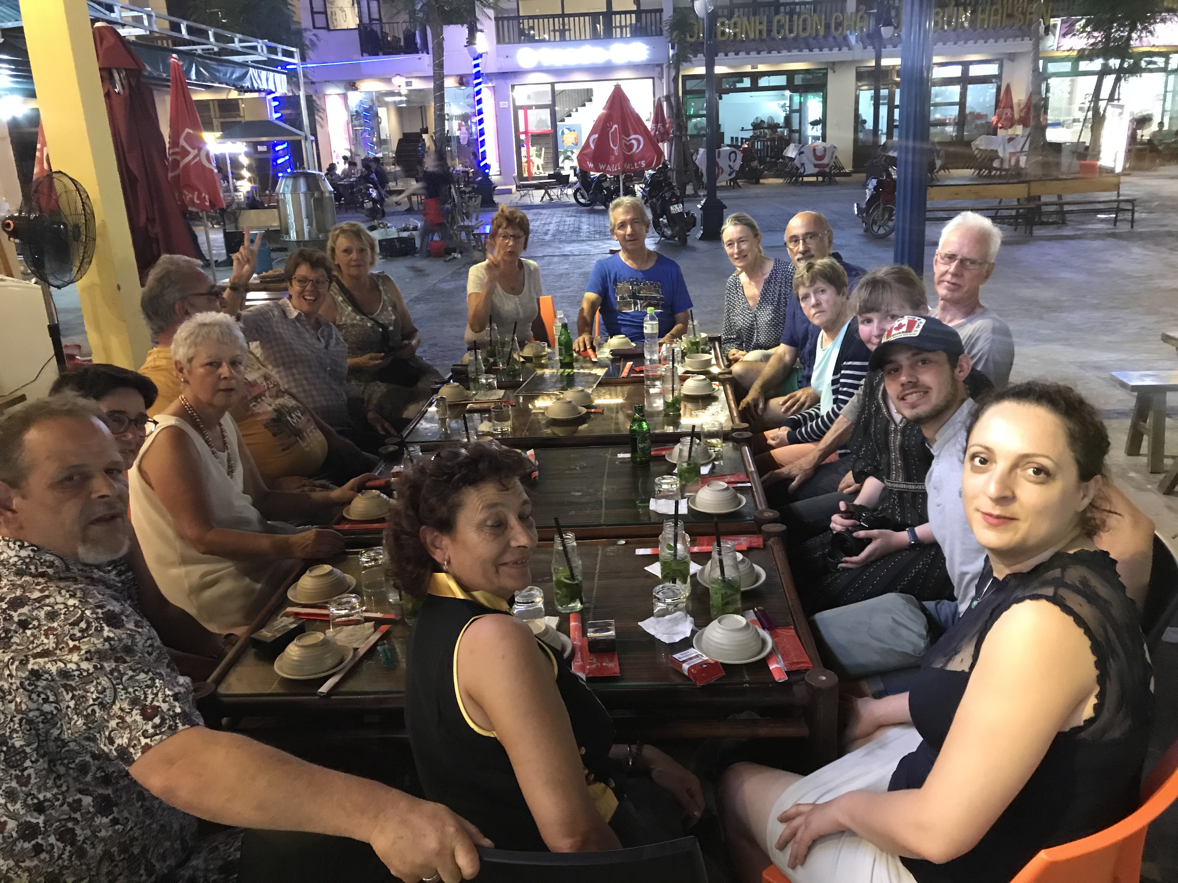 Nous arrivons à la gare d’Halong vers 6h30. J’ai très peu dormi mais je ne me suis pas réveillée pendant mon sommeil. Après un petit déjeuner au restaurant, on prend le bus pour 4h. J’en profite pour continuer un peu ma nuit. Nous arrivons à la baie d’Halong, 7eme merveille naturelle du monde. On mange sur un bateau au milieu de la baie. C’etait très bon et le cadre féerique. On a passé 4h à naviguer entre les rochers de la baie c’était vraiment magnifique. On a également visité une grotte sur l’une des îles. On avait pas le ciel bleu mais bon pas de pluie c’est déjà pas mal. On avait quand même super chaud, l’humidité était aujourd’hui de 90% ! Ce soir c’est dîner libre. Nous partons à 16 personnes au restaurant. C’etait assez compliqué car Matthias et moi étions les seuls à savoir parler correctement anglais. On s’est donc occupé du repas des 16 personnes du groupe. C’etait franchement éprouvant, je ne le referai pas une 2ème fois