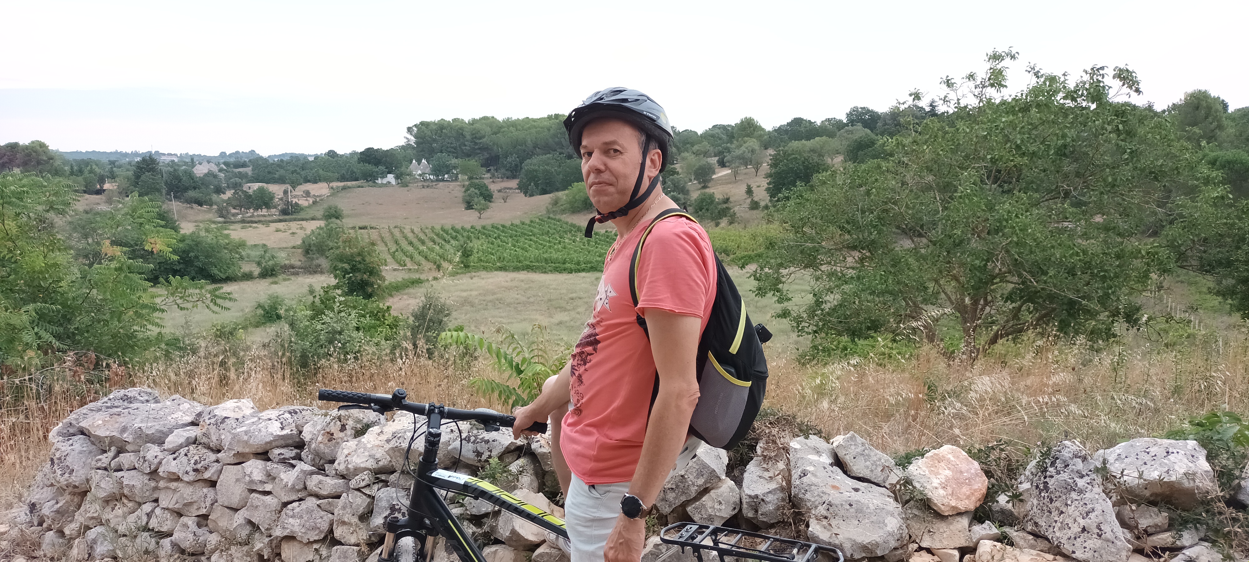 En début d’après-midi, nous allons nous rafraîchir à la piscine. Le temps devient orageux. Nous partons vers Locorotondo où nous avons prévu de faire une balade en vélo. Nous louons les vélos au centre ville et nous commençons notre tour au milieu de la circulation....Pas sympa de rouler au milieu des voitures. Heureusement, nous rejoignons bientôt un chemin bucolique au milieu des vignes, des oliviers et des trulli. Il manque juste le soleil ! Mais vu les pentes que nous devons emprunter, c’est pas plus mal qu’il fasse moins chaud ! Sur le chemin du retour, nous évitons la circulation en passant par la vieille ville de Locorotondo. Le centre historique paraît très joli. Cela nous donne envie d’y passer la soirée. Nous arpentons les rues de cette charmante ville aux façades blanches. J’adore admirer ces rues joliment décorées.