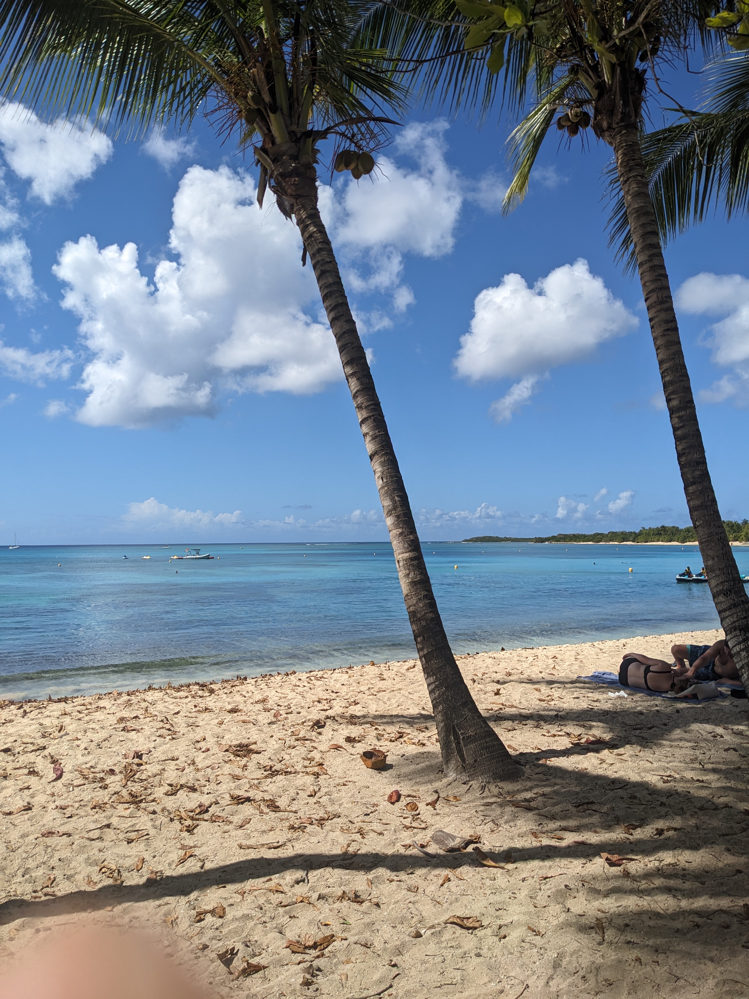 Nous poursuivons ensuite vers Port Louis. La ville semble abandonnée. Nous décidons de repartir mais d’aller quand même voir la plage du souffleur. Belle surprise ! Grande plage de sable blanc avec des palmiers et tamariniers. Nous mangeons sur place un poulet façon boucané. Rien d’extraordinaire mais il fait bon sous les arbres. Nous profitons ensuite de la plage.