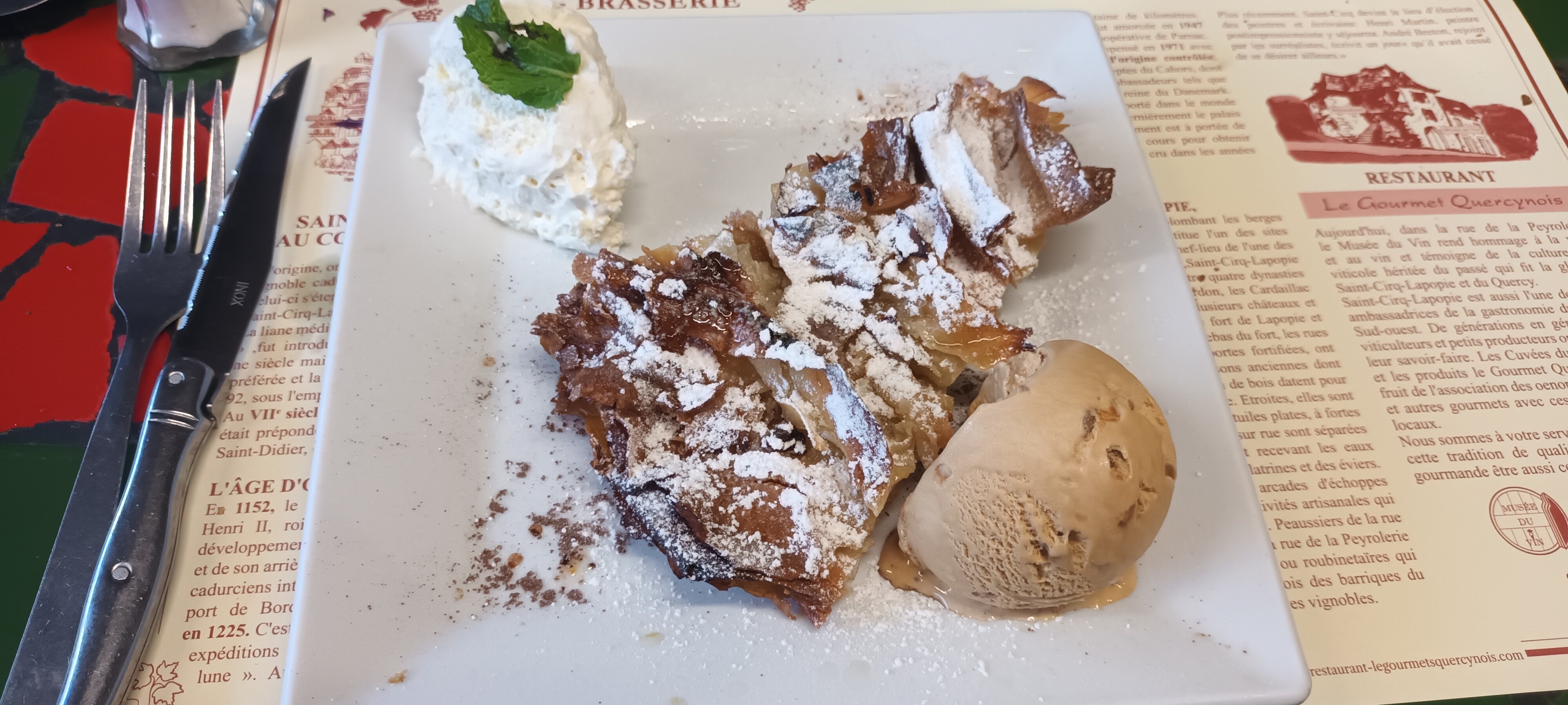 Nous dînons sur place : salade avec des produits locaux (toujours du canard et des noix) et une spécialité du Quercy pour moi : Lou pastis (gâteau feuilleté aux pommes)