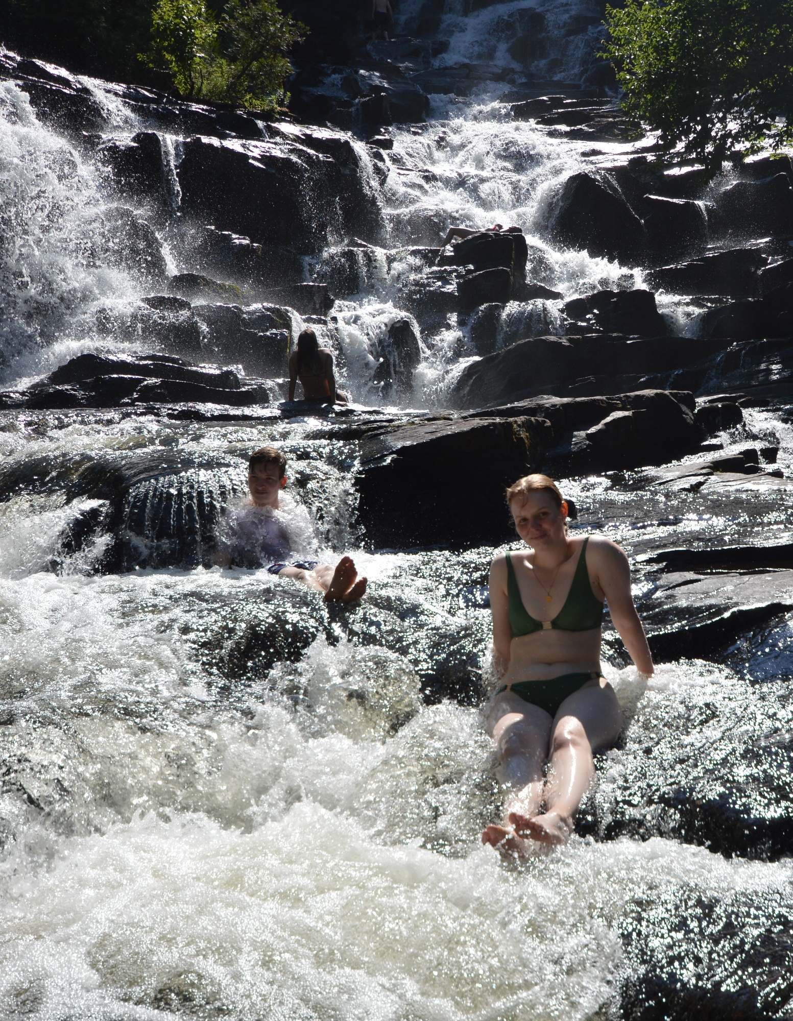 Ensuite nous arrivons près d’un rivage, nous déposons nos deux canoës et nous partons pour une randonnée d’1h à pied. C’est difficile, ça grimpe beaucoup mais un magnifique décor nous attend : les cascades Waber . Elles sont magnifiques, l’eau est très chaude. Nous n’hésitons pas à nous baigner ! Trop bien ! Un spa naturel !
