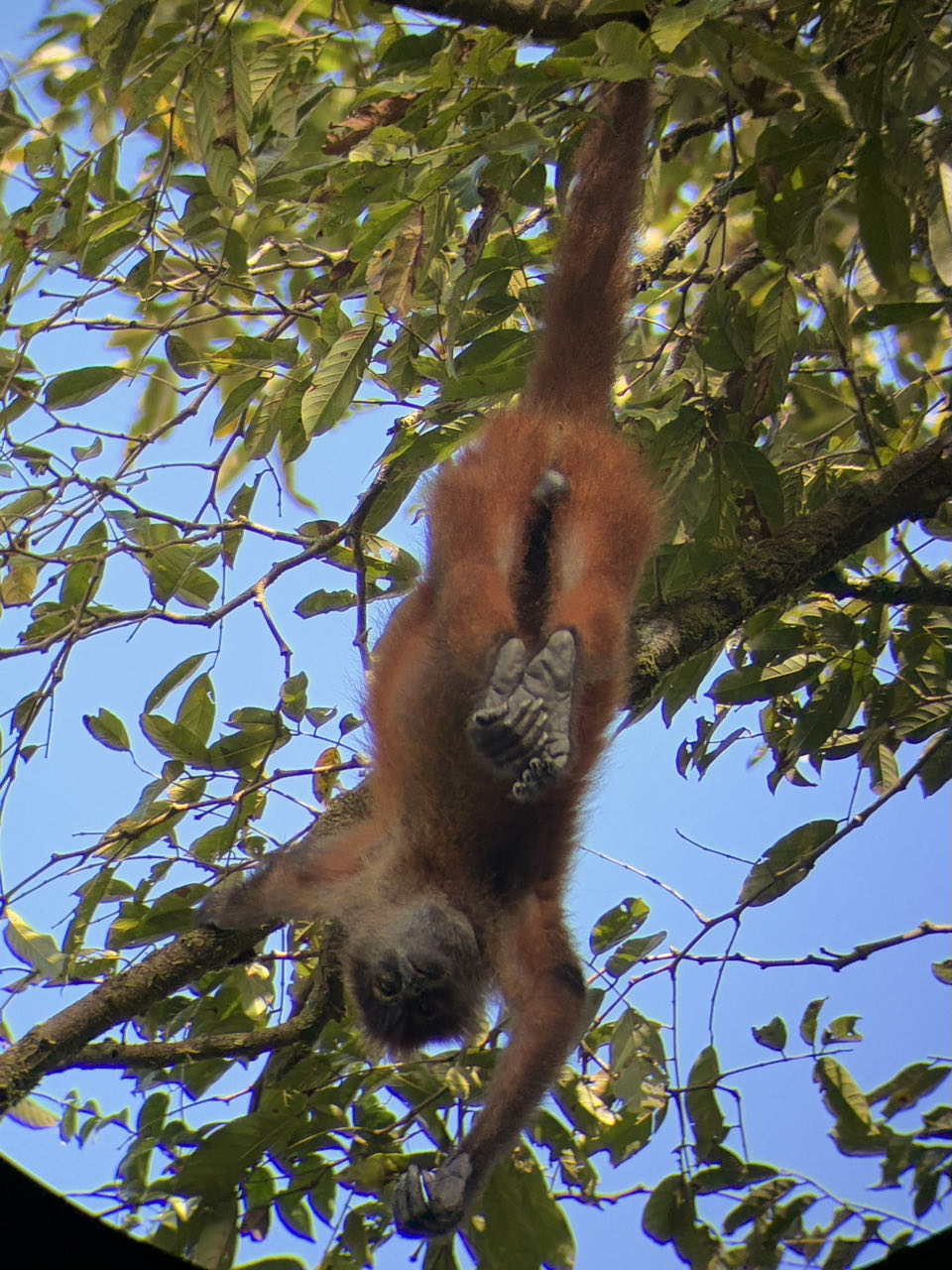 Nous voyons dès le début de la visite un singe écureuil, il est tout petit et saute d’arbre en arbre. Pendant la balade on voit également une « gold spider », des singes araignées et même un fourmilier dans les arbres ! De l’autre côté de la berge on voit un crocodile. Nous prenons le déjeuner dans le réfectoire des rangers puis nous repartons en excursion. On voit deux petits caïmans, encore des singes araignées et quelques beaux oiseaux. Notre guide est équipée d’une lunette super zoom qui nous permet de voir très nettement les animaux. Les photos ont été prises dans la lunette. On prend le bateau retour vers 13h.