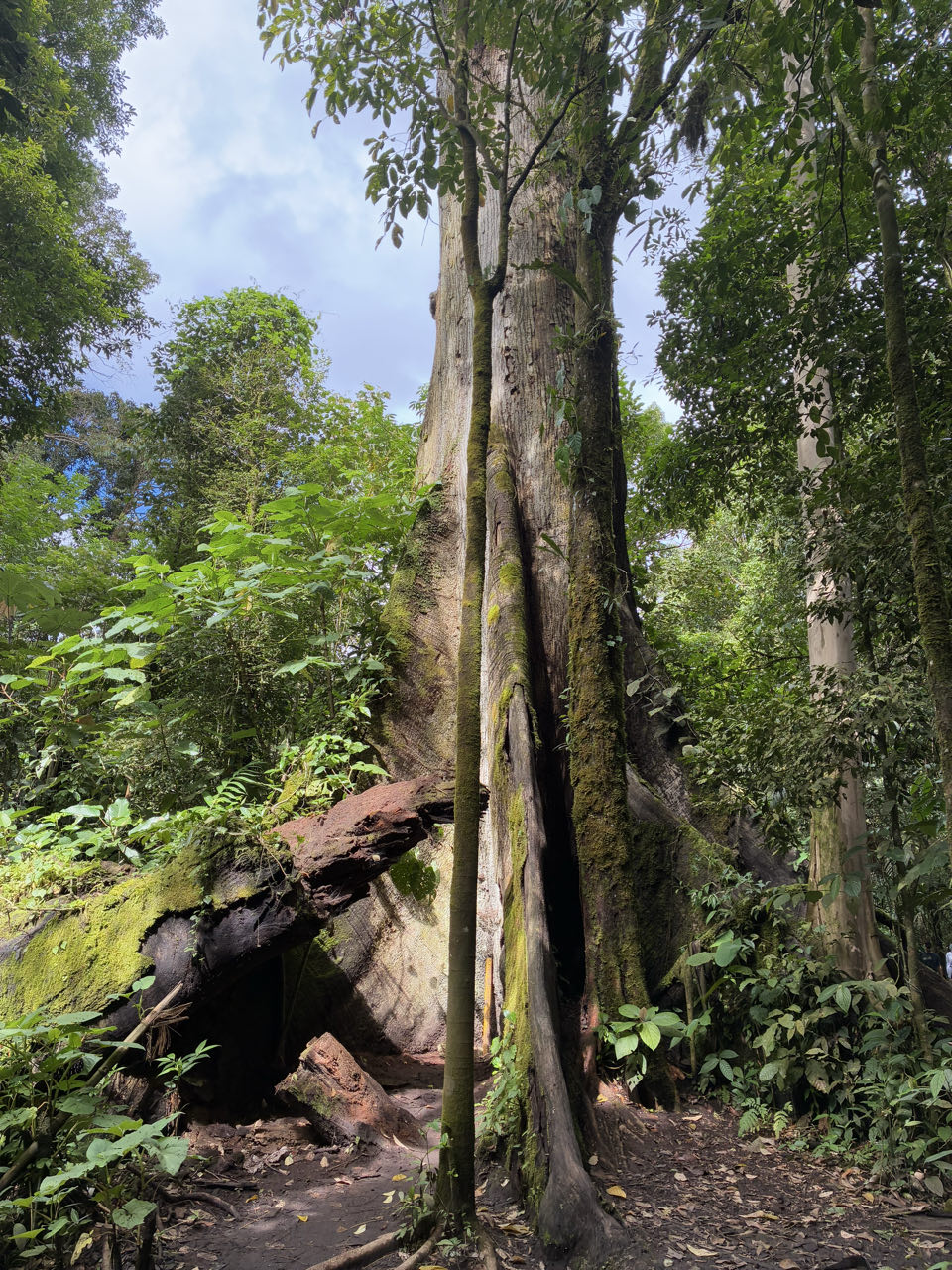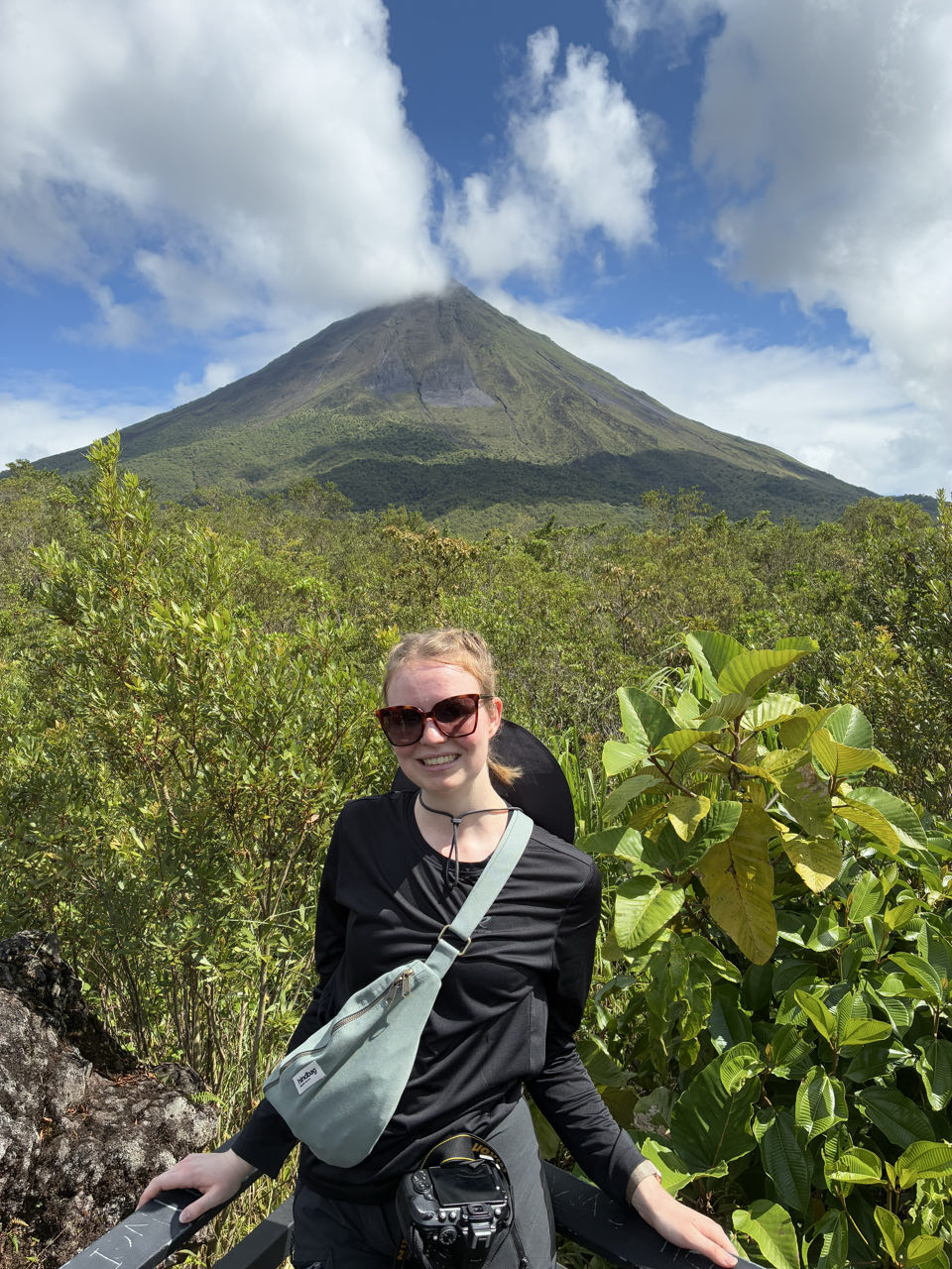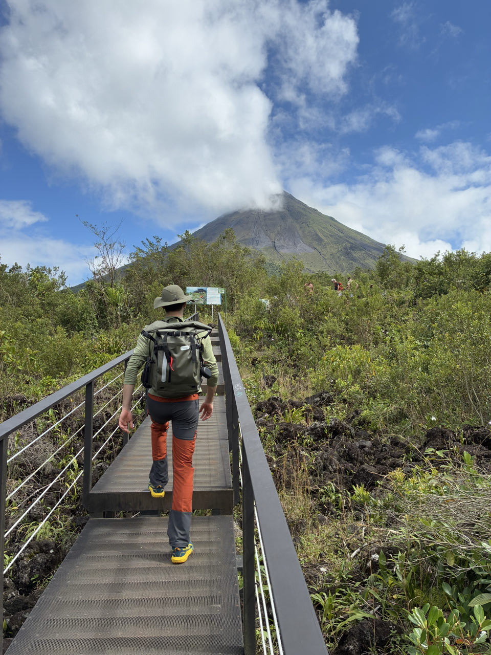 Au milieu de la rando, il y a un mirador sur le volcan Arenal. C’est la seule partie du sentier qui n’est pas ombragée : le mirador se situe sur les coulées de lave de 1992. La nature commence à se régénérer, mais ne laisse pas encore place aux grands arbres. Ce sont d’abord de plus petites plantes qui poussent rapidement, qui apportent de la fraîcheur au sol pour laisser de plus grandes plantes pousser, plus lentement, et ainsi de suite, pour recréer une forêt tropicale humide