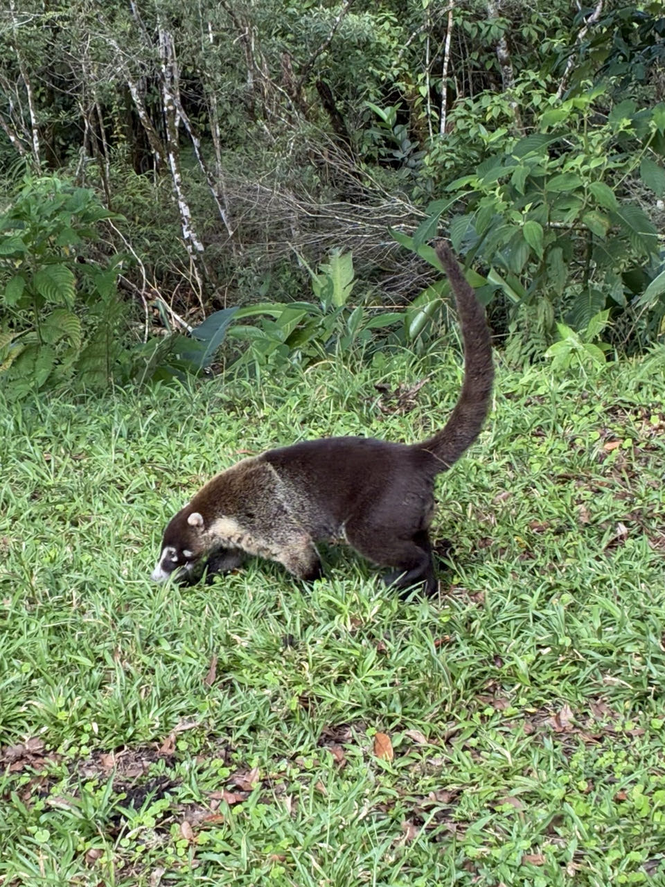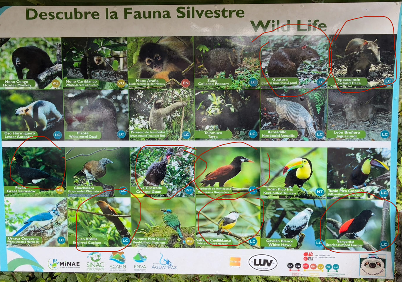 Nous partons ce matin au Parc National du Volcan Arenal. Nous avons une boucle de 6km à réaliser. Sur le sentier, Nathan réussi à repérer pas mal d’animaux. Cette fois ce sont plutôt des mammifères terrestres (pas dans les arbres comme les singes et paresseux), j’ai entouré ceux qu’on a vu sur la dernière image (je les ai pris en photo avec mon appareil seulement). On a aussi vu un écureuil, un coati, et un serpent sur lequel j’ai failli marcher, oups