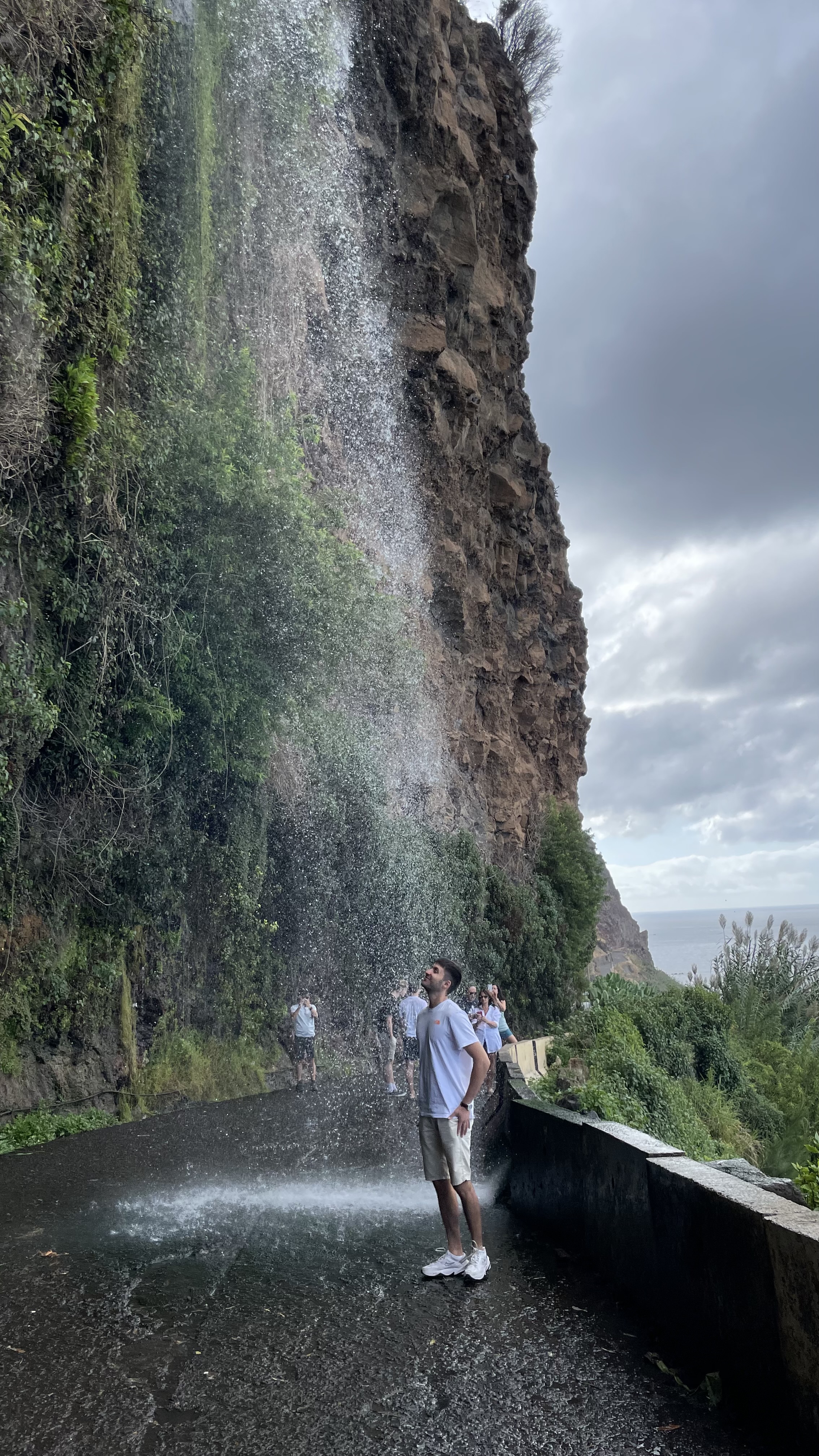 Nous nous arrêtons d’abord à côté de Ponta do sol, pour voir une cascade qui se jette directement sur la route. C’est un peu un truc de touriste, mais assez impressionnant ! On ne peut pas y circuler, la route est réservée aux habitants qui passent volontiers sous la cascade avec leur véhicule