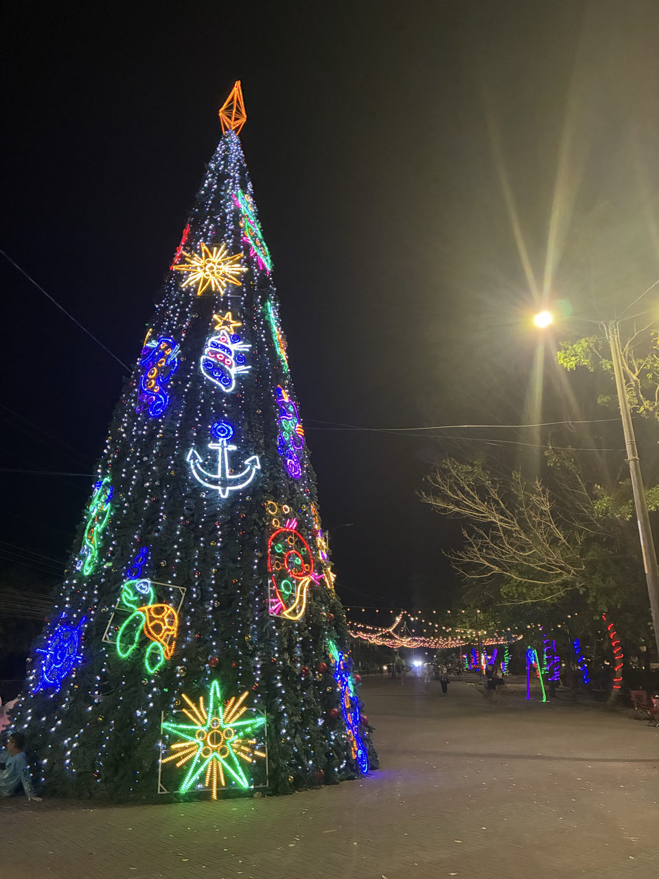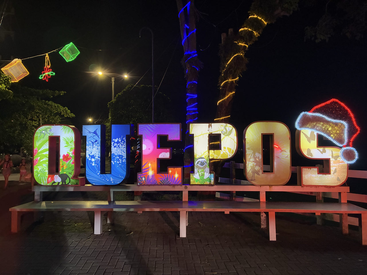 Notre nouveau logement est très sympa, aussi dans une forêt. On a déjà aperçu 3 aras rouges qui vivent autour de l’hôtel ! Nous dînons dans un très bon soda au centre ville. Ici, tout est encore illuminé pour Noël, mais aussi avec des décos de la mer