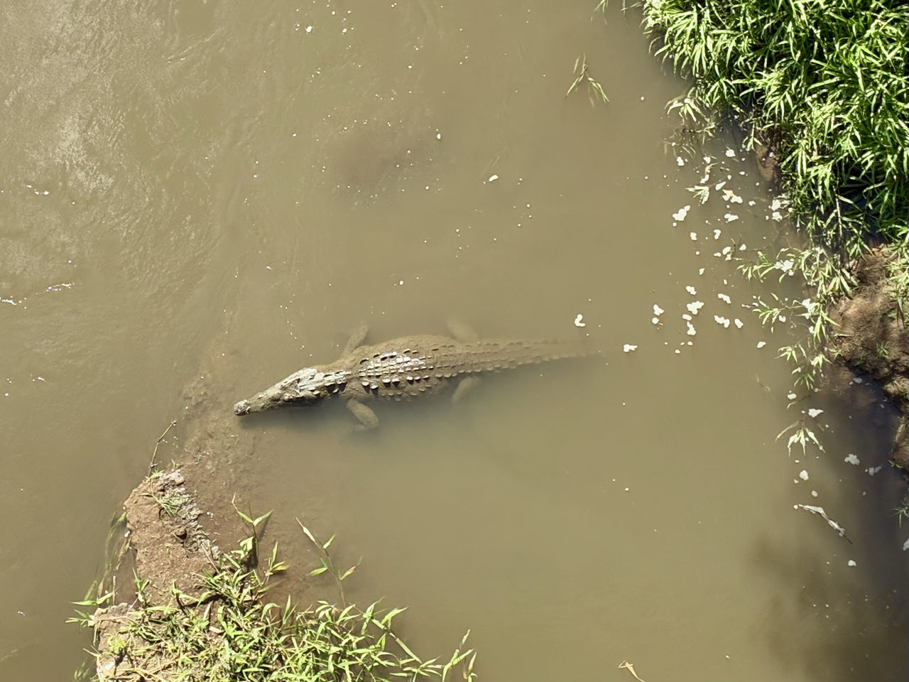 On poursuit notre chemin jusqu’au pont de Tarcoles. Il est connu parce qu’à coup sûr on peut apercevoir des crocodiles géants en contre bas. Nathan avait peur, pas envie de basculer par dessus la barrière ! Il y avait même des travaux de génie civil sous le pont, pas très loin des crocodiles (je me demande ce qu’ils ont écrit dans leur Plan de Prévention Sécurité 🤭). Il fait très chaud et lourd. On décide de prendre une glace, mais c’était une genre de chaîne pas top. Tant pis, au moins ça rafraîchit !