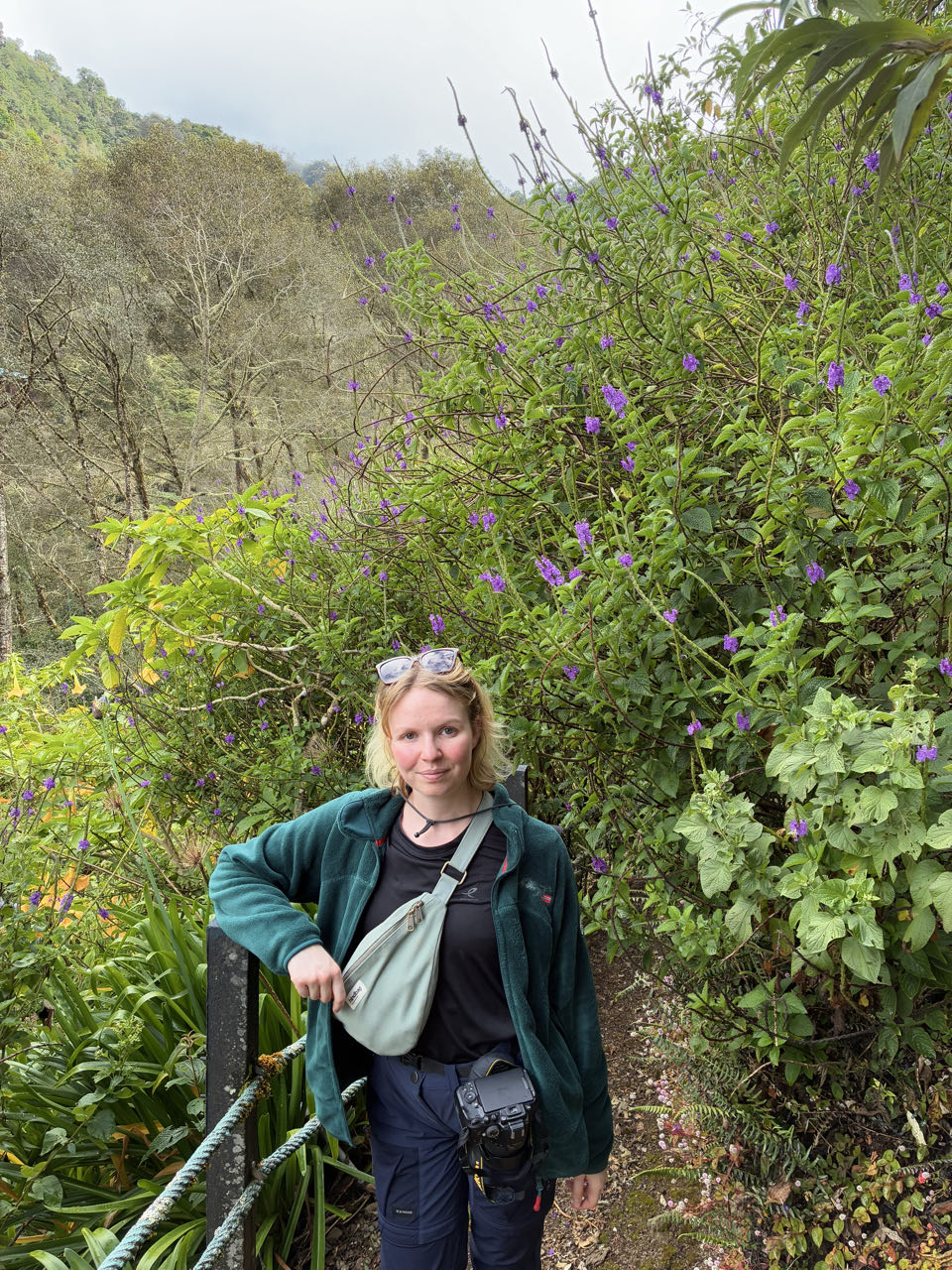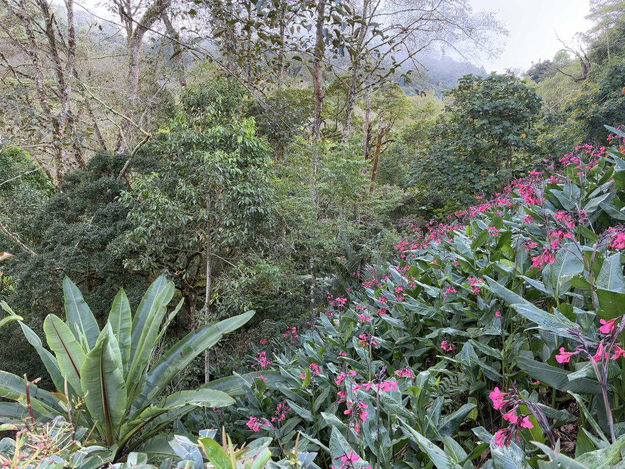 Nous arrivons dans la vallée des quetzals. Il fait tout de suite plus frais que sur la côte (10 degrés) . C’est un endroit assez reculé par rapport à la route principale qui mène à San José. Notre lodge est une petite cabane proche d’une rivière. Sur recommandation de la réceptionniste, on visite un jardin privé d’un restaurant. Il est grand et verdoyant. Ensuite on fait un sentier pour voir une cascade. Nous croisons très peu de monde pendant la balade, ce n’ est pas très touristique ici. Pour le repas du soir, Nathan mange un filet de truite de la rivière et Marine des patacones (sorte de rosti de banane plantains). Les deux plats sont très bons