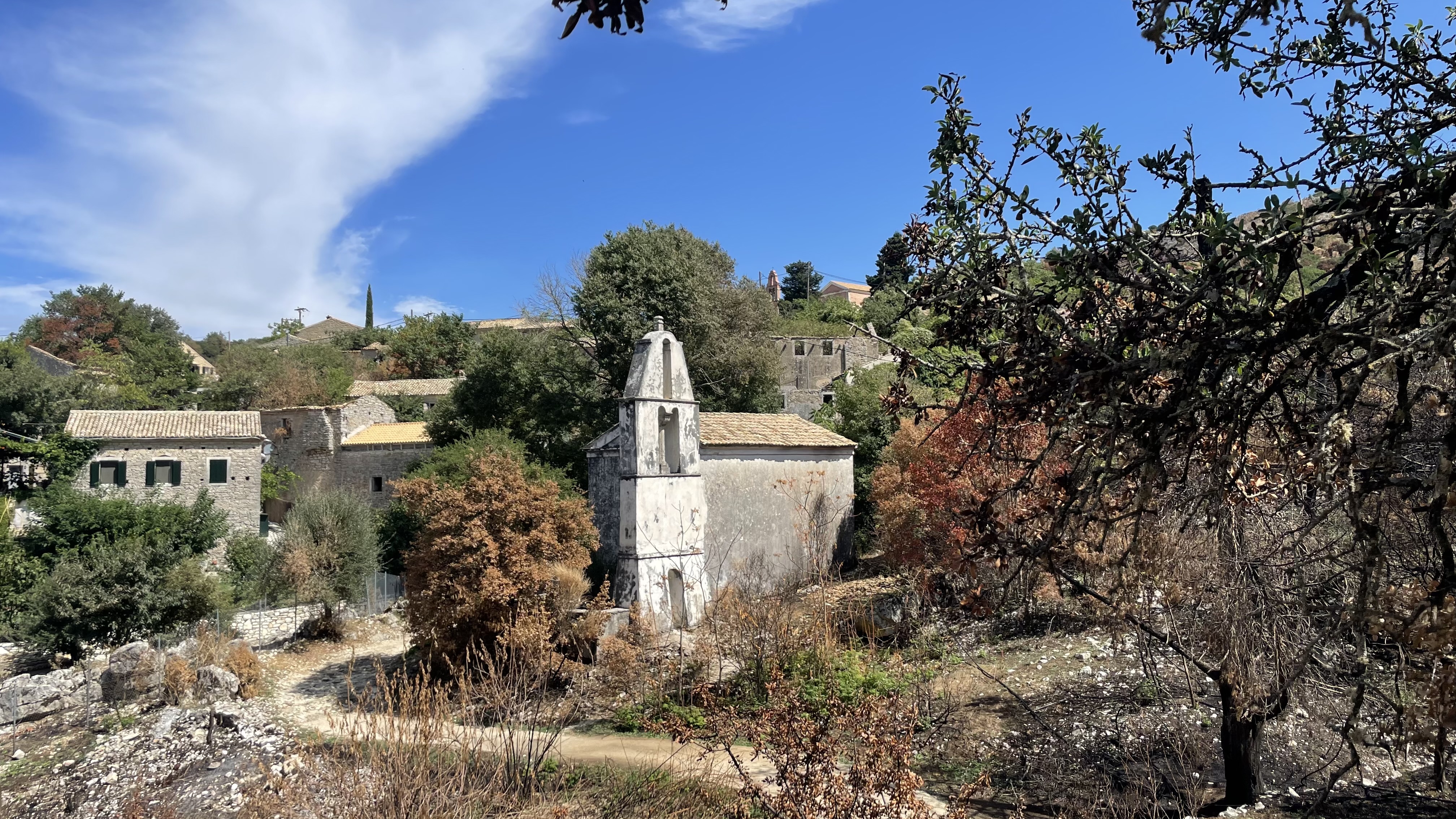 On décide donc de partir pour une journée visites au nord est de l’île ! On commence par le vieux Perithia. C’est le plus vieux village de l’île, en partie en ruine, classé au patrimoine mondial de l’UNESCO. Sur la route, nous voyons les traces des incendies qui ont ravagé l’île pendant l’été. Les flammes sont passées tout près du village, mais il ne semble pas avoir été touché ! C’est un joli village de pierres, entre mer, montagne et végétation. Nous déjeunons d’excellentes salades dans une taverne qui occupe une ancienne bâtisse.